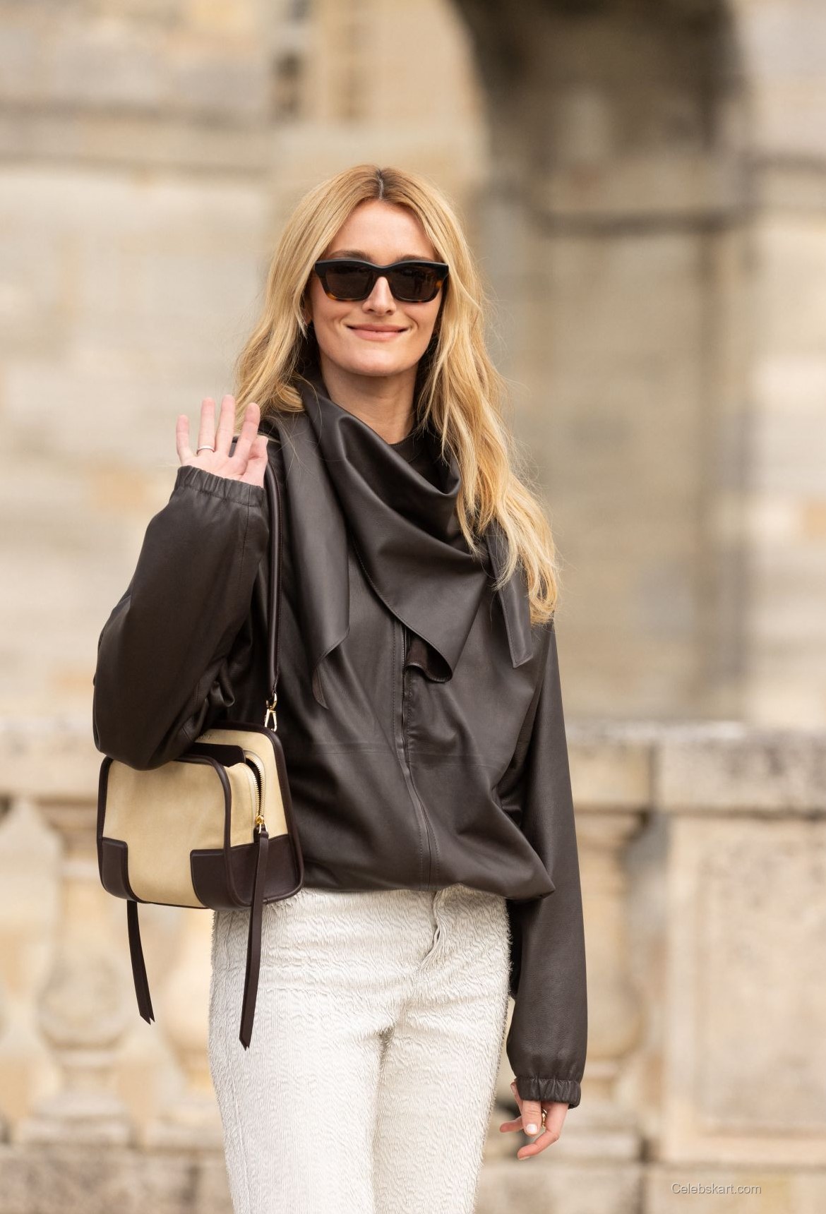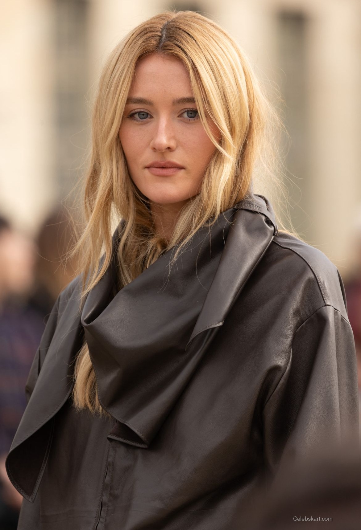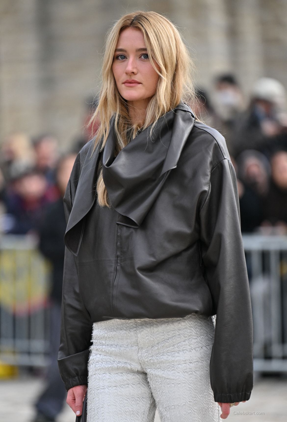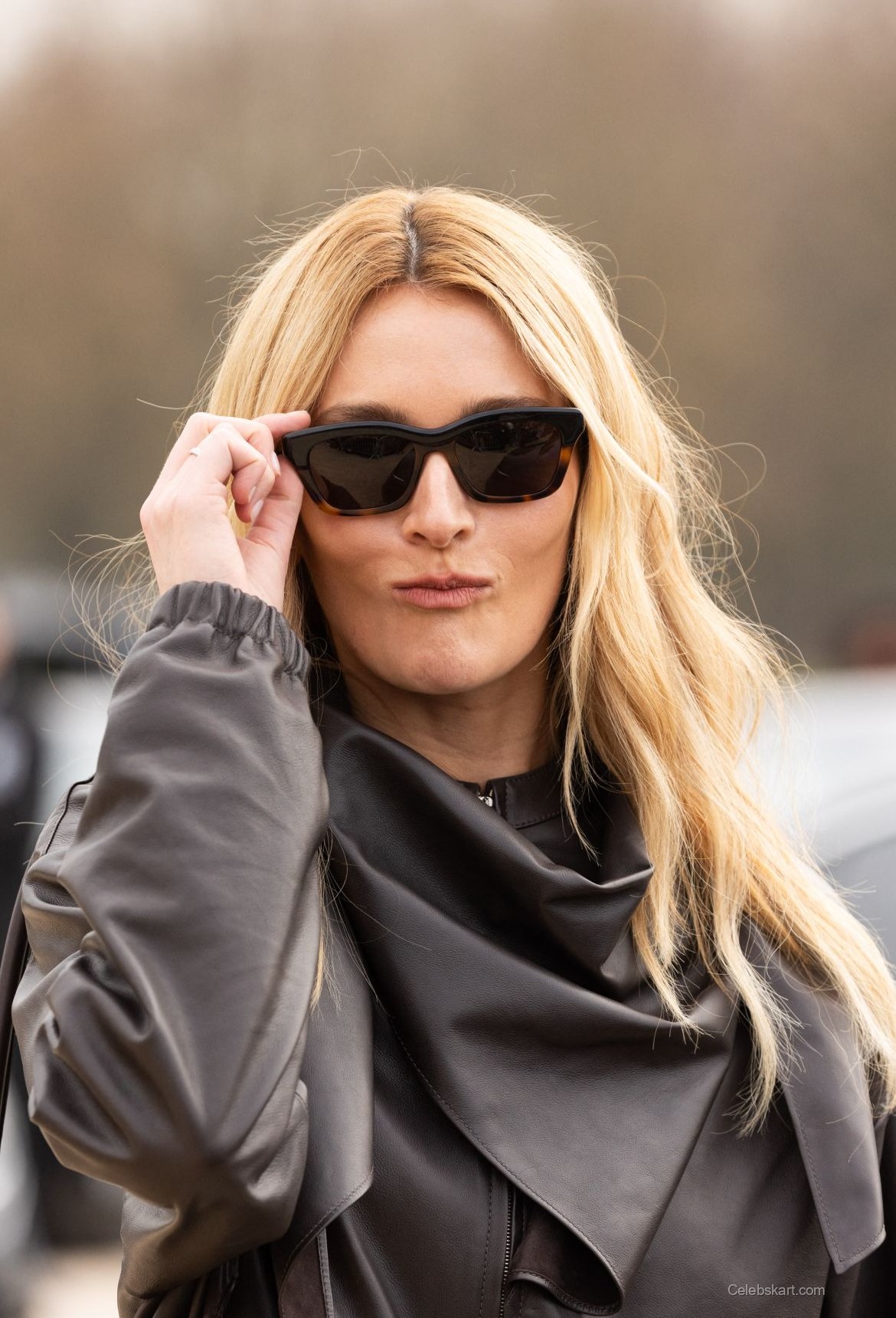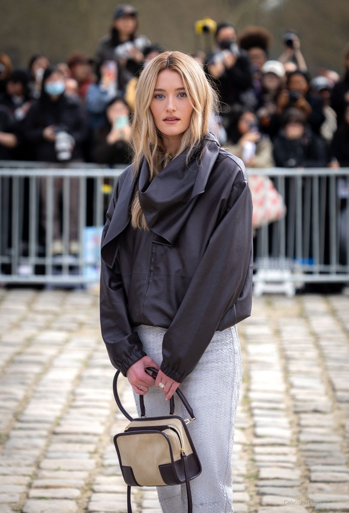 Pidgeon was seen walking confidently, flashing a smile as she waved to the crowd. Her relaxed pose, with one hand subtly holding her bag, highlighted her effortless approach to fashion. The natural backdrop of Paris, filled with eager fans and photographers, set the perfect scene for her appearance.