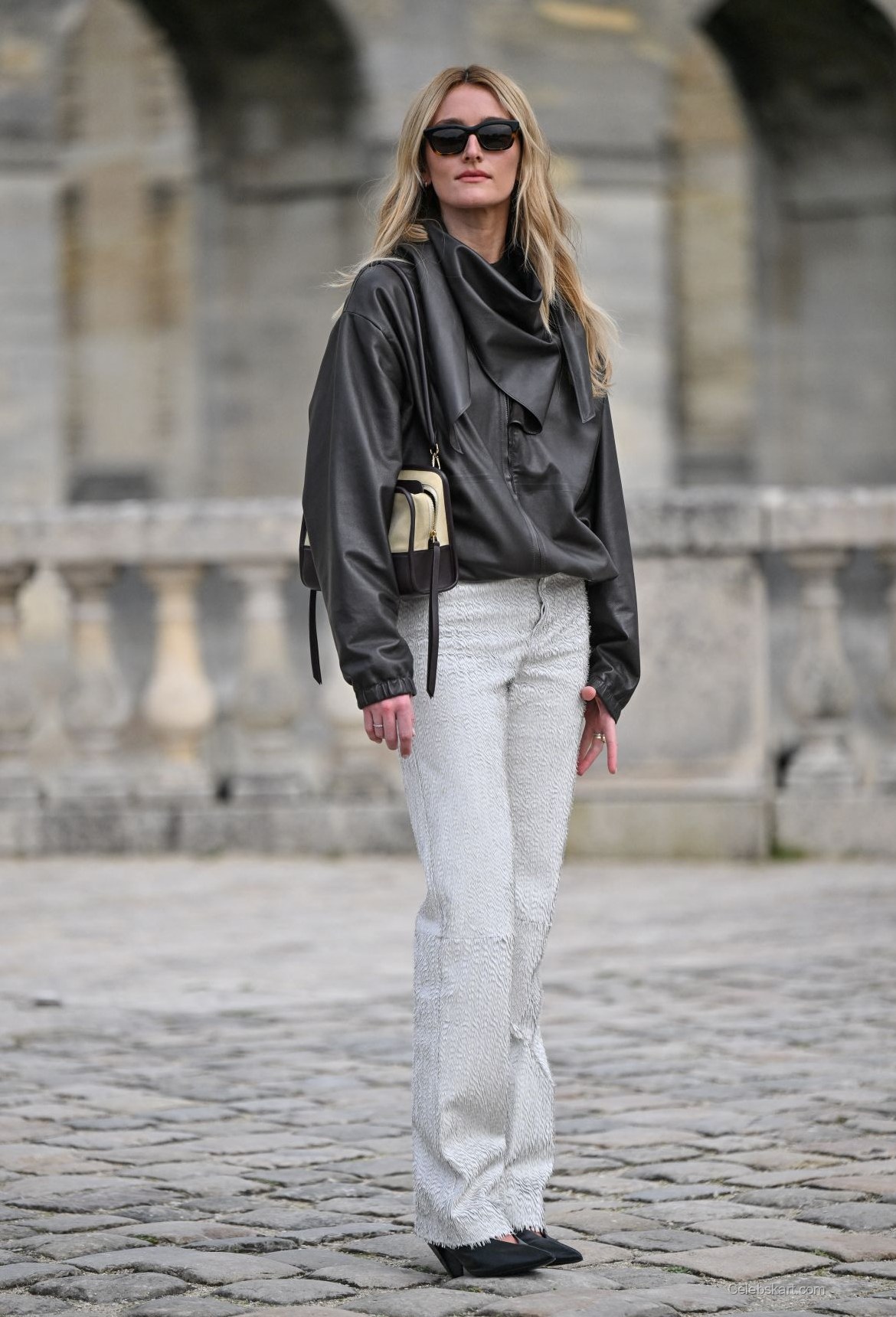 Sarah opted for a sleek black leather jacket that featured an interesting draped design. The jacket's unique silhouette made it a standout piece against the soft, textured white pants she paired it with. Completing her ensemble was a stylish bag that featured a striking combination of beige and deep brown, adding an elegant contrast to her outfit.