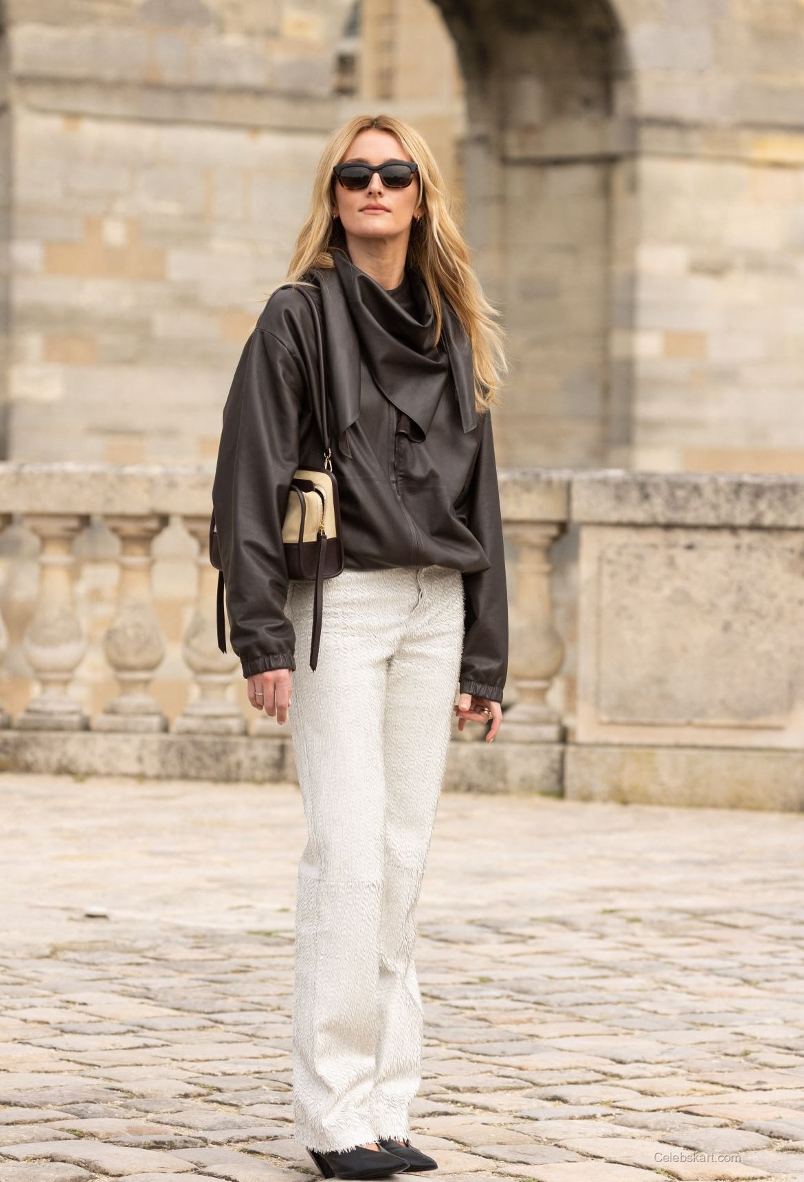 This particular look stands out in several ways. Firstly, the juxtaposition of the structured leather jacket against the soft, flowing lines of her pants creates a visually balanced outfit. Furthermore, opting for minimal accessories emphasized the statement pieces of her ensemble. Her makeup was kept simple, enhancing her natural beauty and allowing the outfit to take center stage.