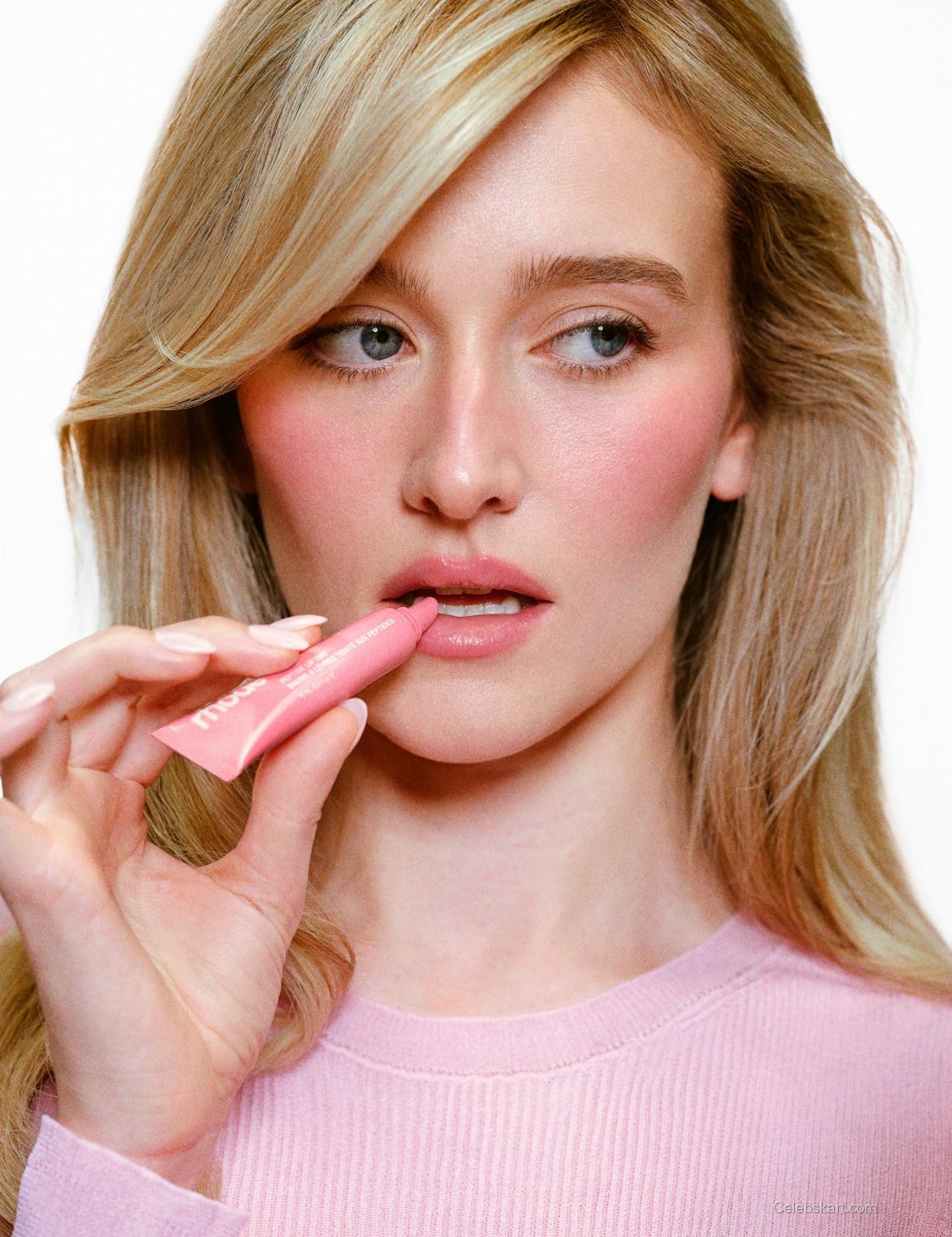 Posing gracefully, Sarah’s expression was inviting as she engaged with the camera. The soft, white backdrop emphasized her style, giving a clean and modern aesthetic. As she held a lip product to her lips, the moment radiated an essence of accessibility in beauty. Throughout the shoot, she demonstrated a range of expressions, from playful to thoughtful, that showcased her versatility as a model.