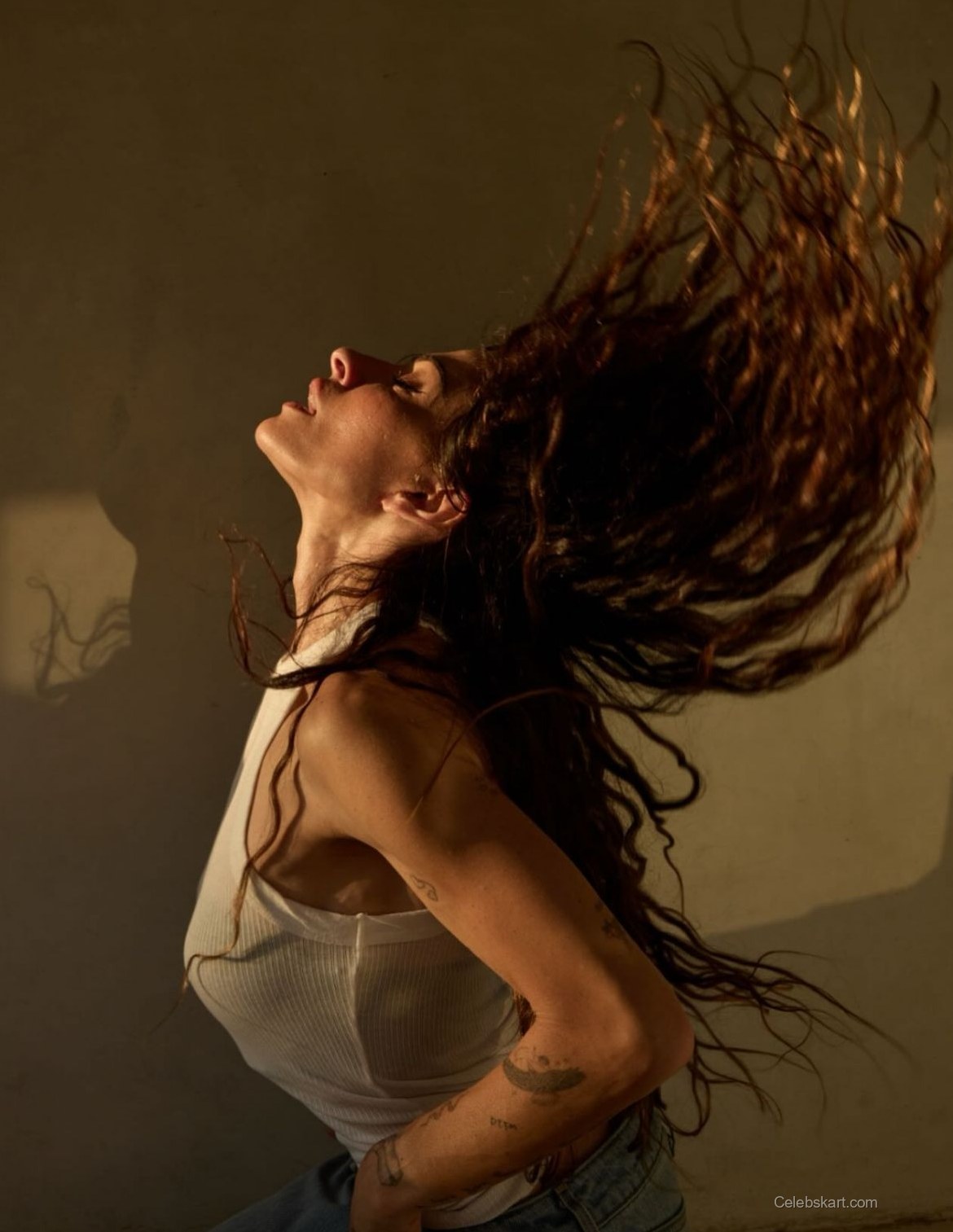 This series of photos features Sarah in a classic white tank top paired seamlessly with distressed blue jeans. The outfit exudes a relaxed vibe, perfect for casual outings while adding an edge with perfectly placed rips. The combination highlights her toned figure and playful spirit, making it a trendy choice for the season.