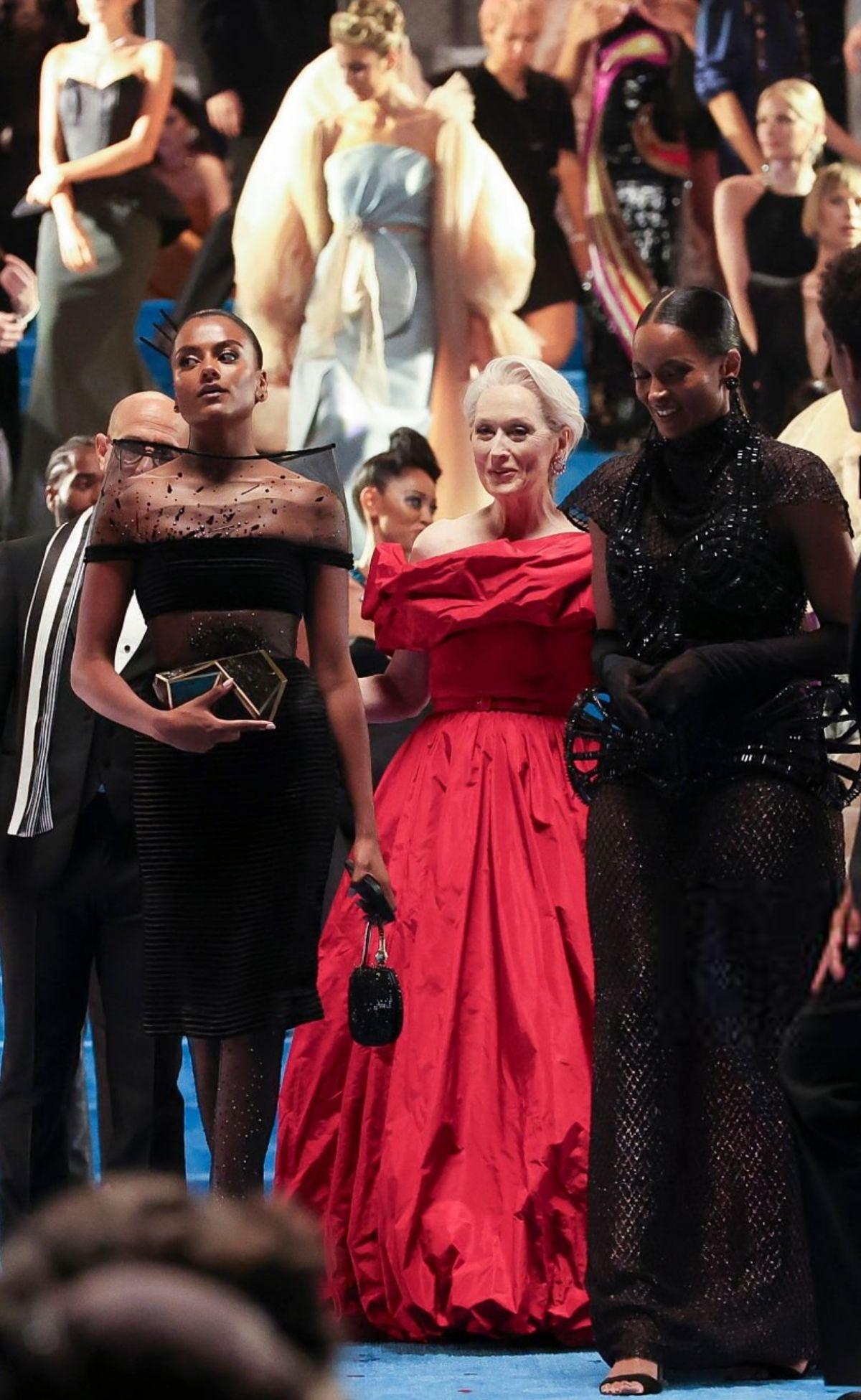 Simone Ashley and Meryl Streep on set in NYC, August 2025