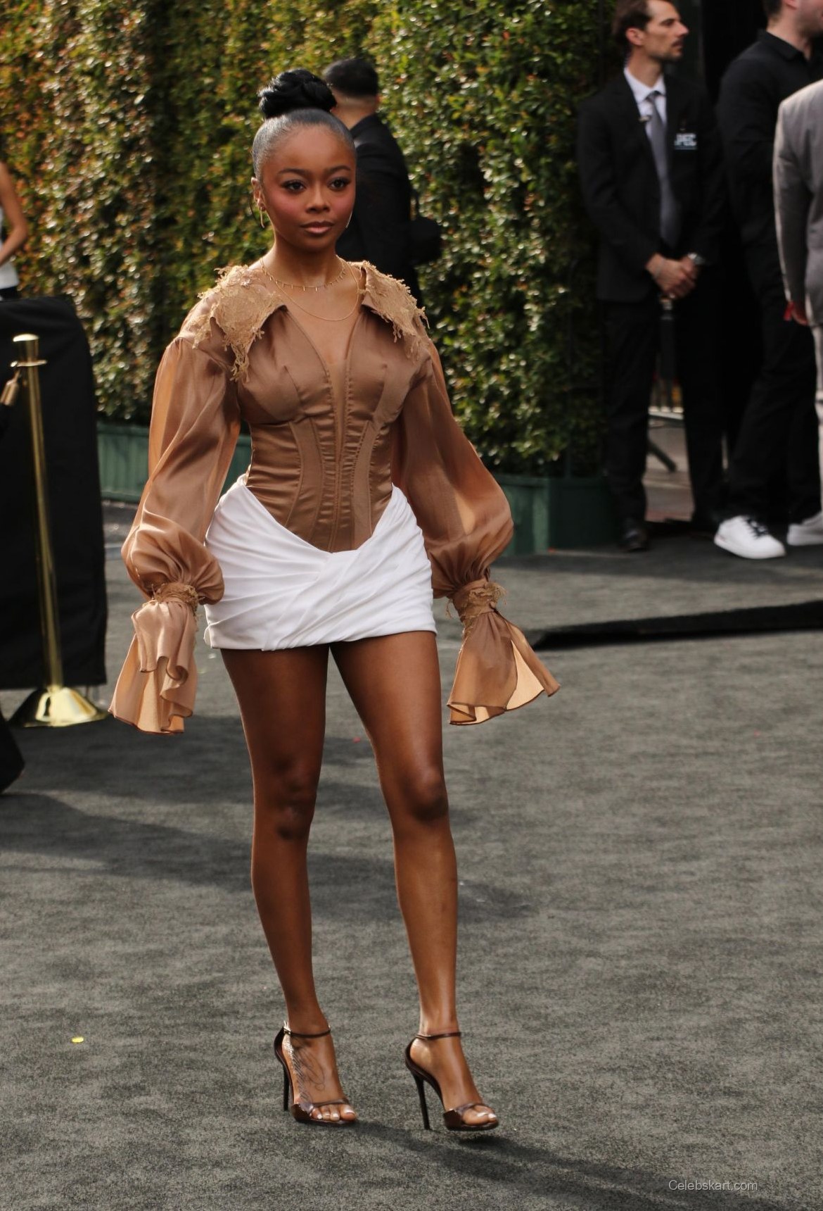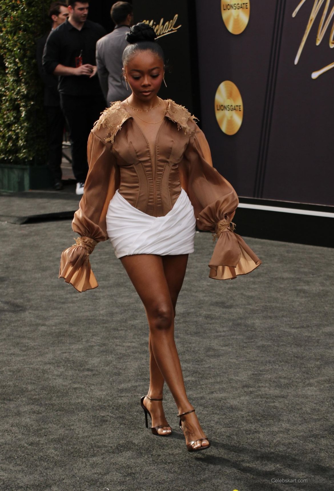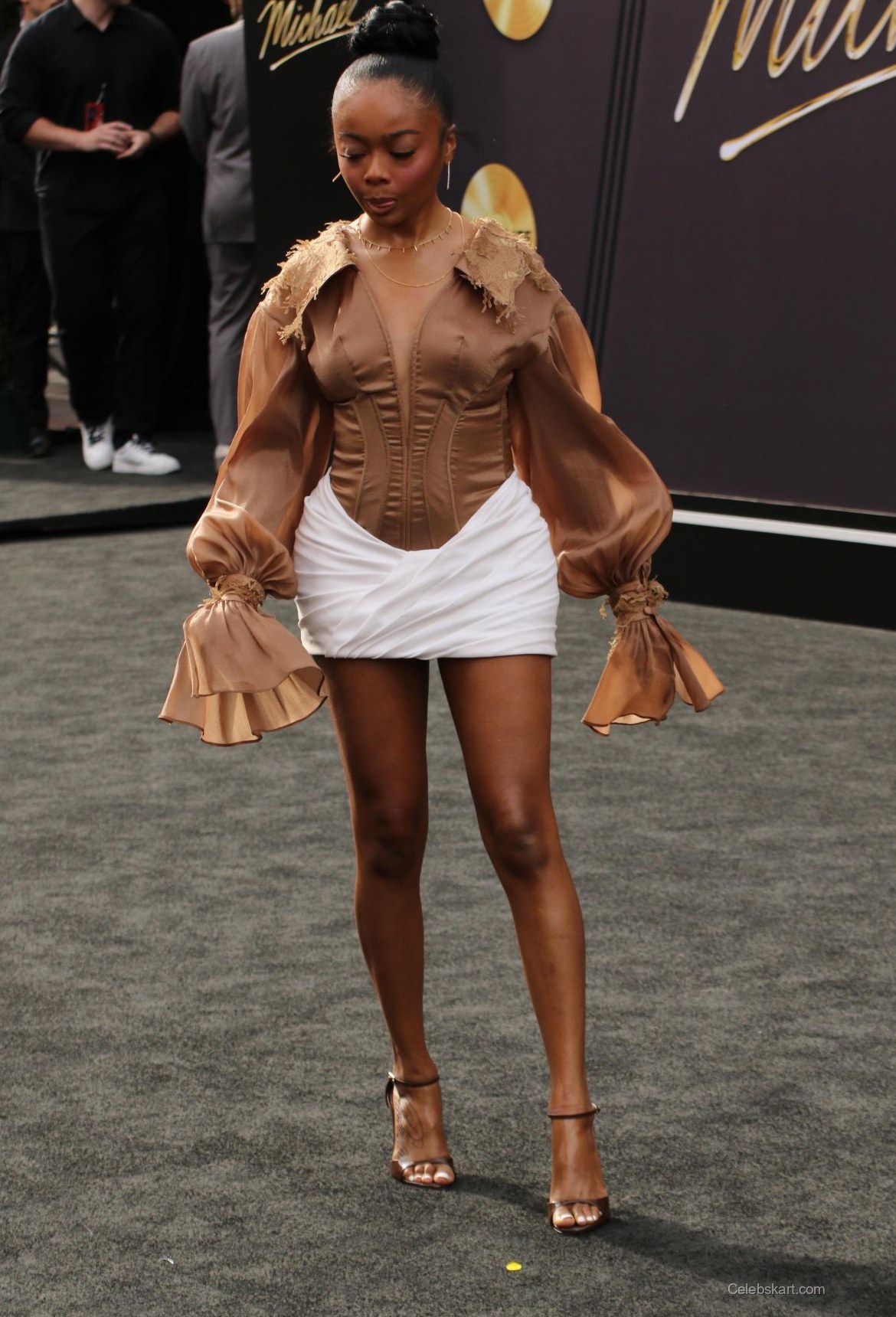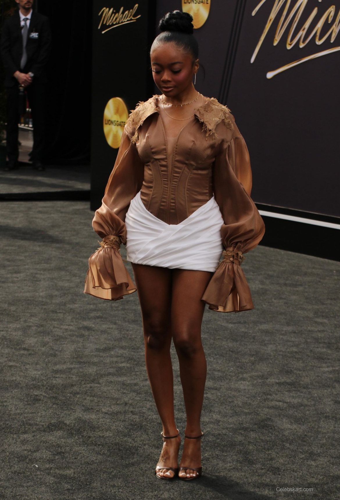 Skai Jackson attended the premiere of 'Michael' at the Dolby Theater in Hollywood. She wore a unique brown blouse with puffed sleeves. The blouse featured intricate detailing around the shoulders. Below, she paired it with a fitted white mini skirt. Skai completed her look with strappy, clear heels. Her hair was styled in a sleek bun, accentuating her vibrant outfit. Jewelry included a delicate necklace and small hoop earrings. Each detail contributed to an eye-catching ensemble for the occasion.