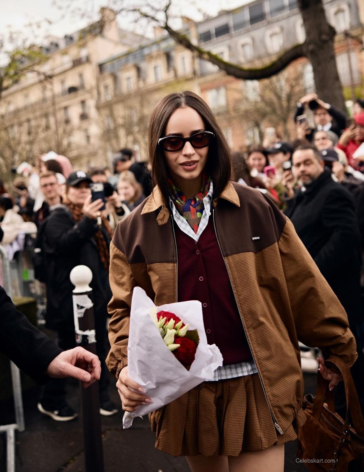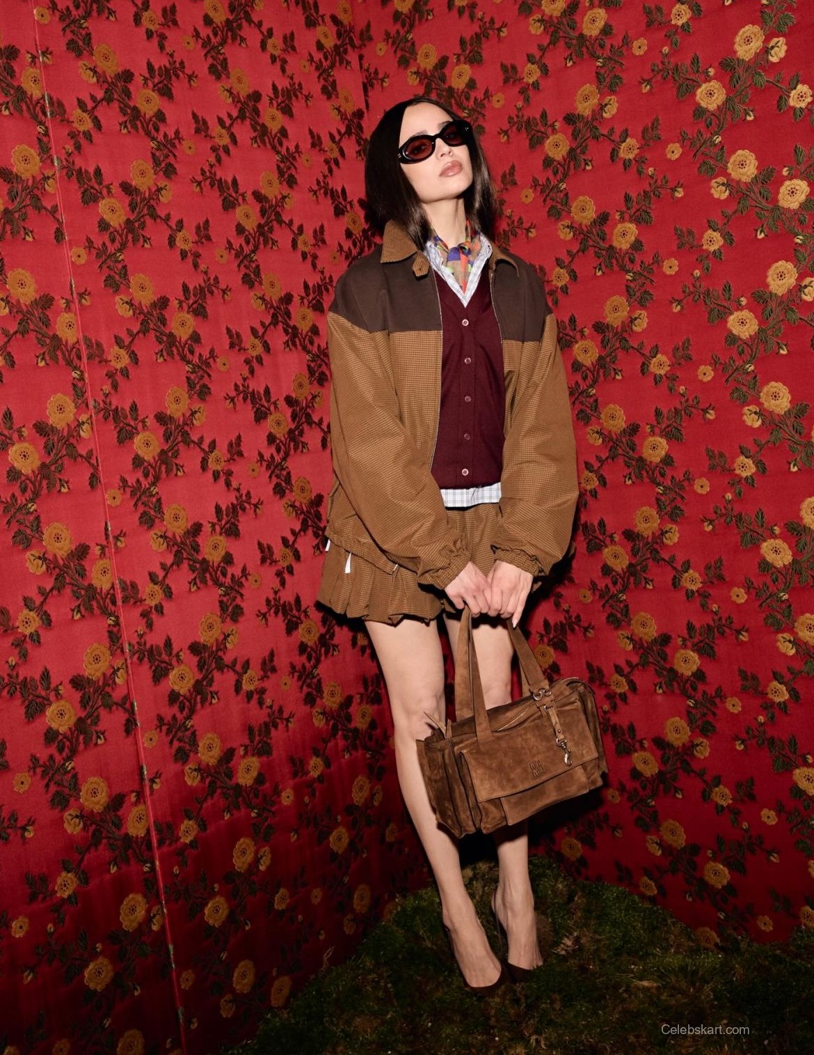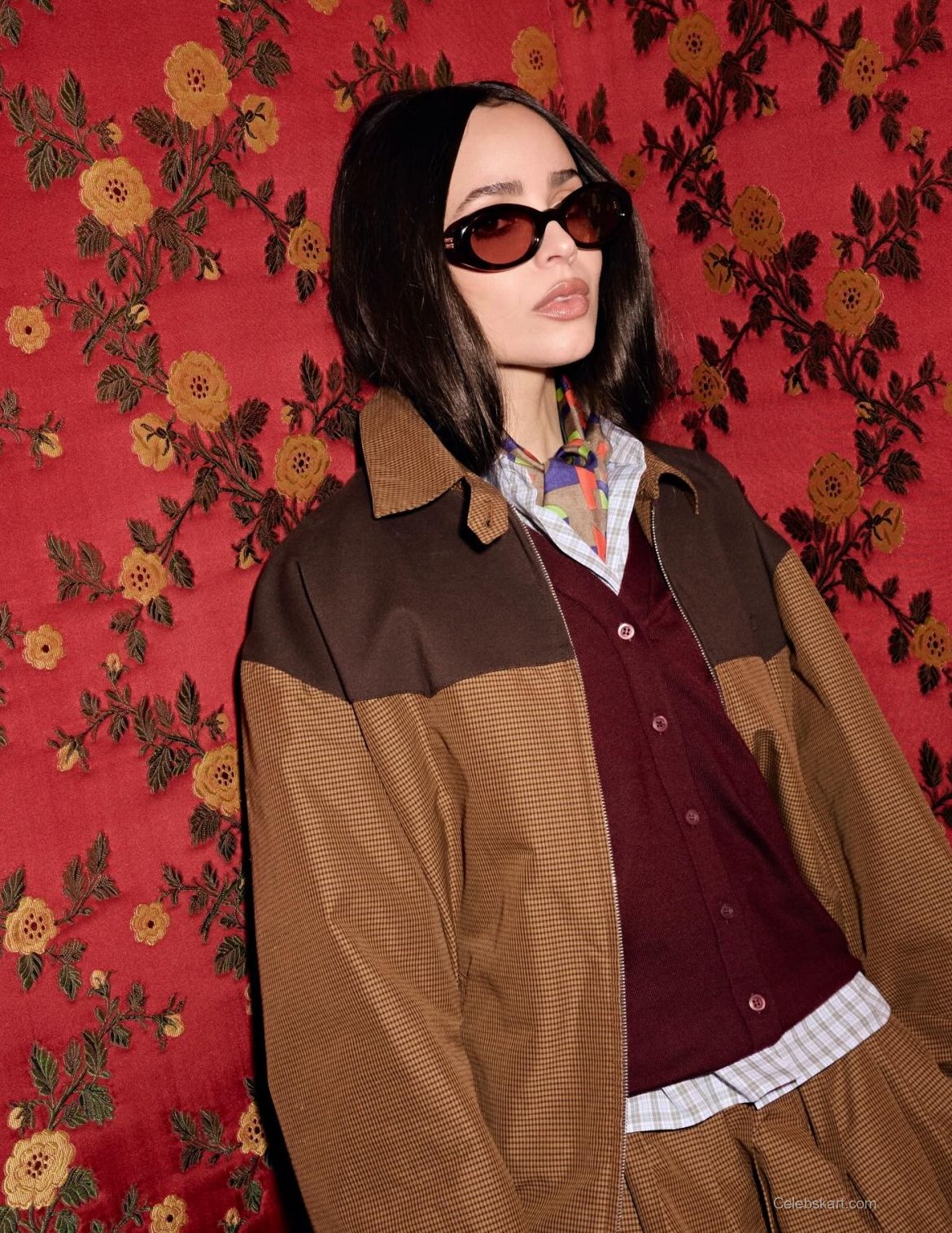 Carson’s look includes a distinctive brown jacket, blending different textures and colors seamlessly. Pairing it with a deep maroon top and pleated skirt, the outfit captures modern sensibility while paying homage to classic styles. The choice of a plaid shirt layered underneath enhances the look with contrast and dimension.
