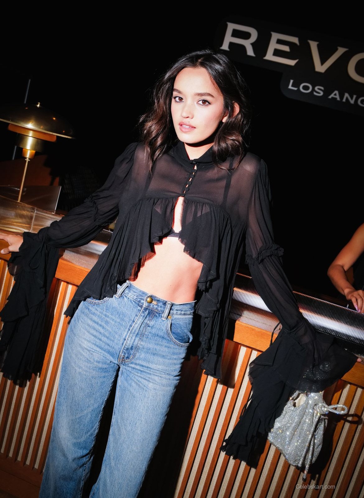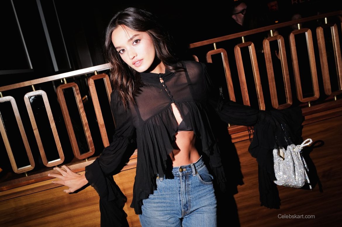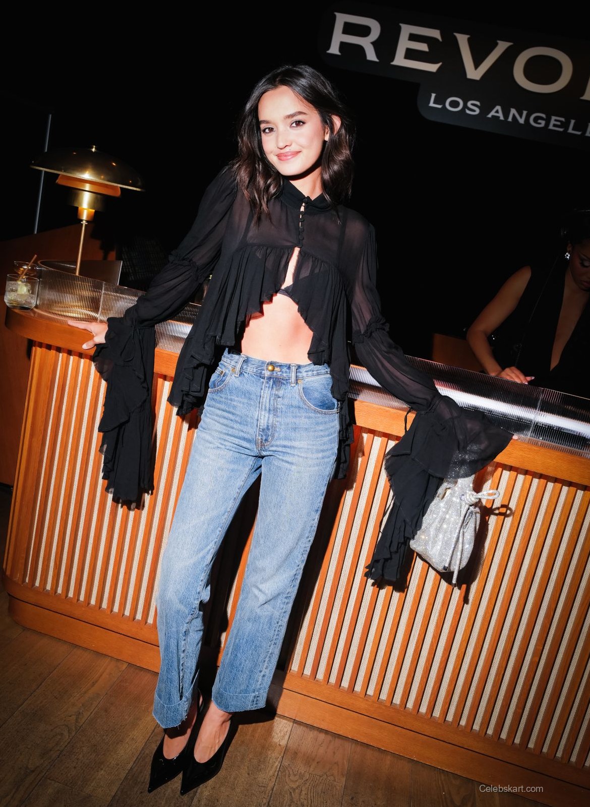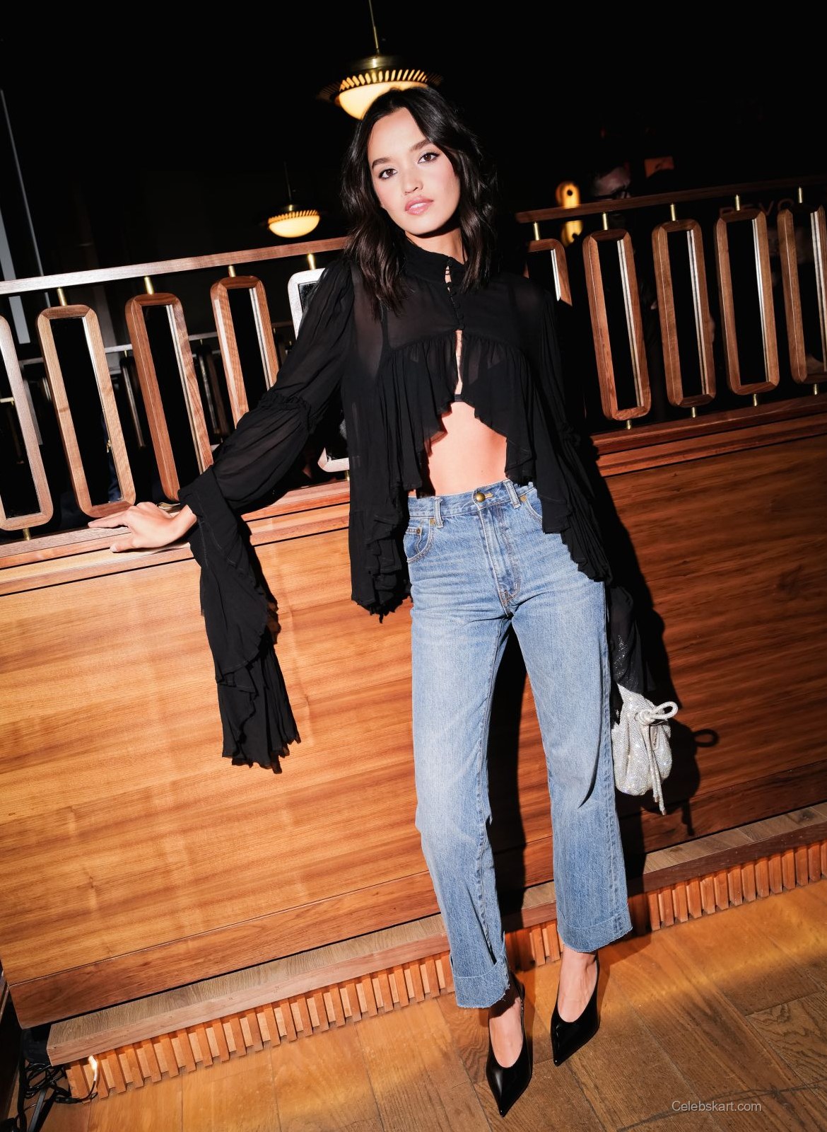 Her black top was a central piece, designed with delicate ruffles and sheer fabric, adding a hint of sophistication. The top’s unique cut showcased her midriff, demonstrating a bold choice in trendy fashion. Paired with high-waisted light blue jeans, Sophia struck a perfect balance between edginess and casual comfort. The jeans had a slightly relaxed fit, which complemented the top beautifully. Completing the outfit were pointed black heels, which enhanced her overall silhouette.