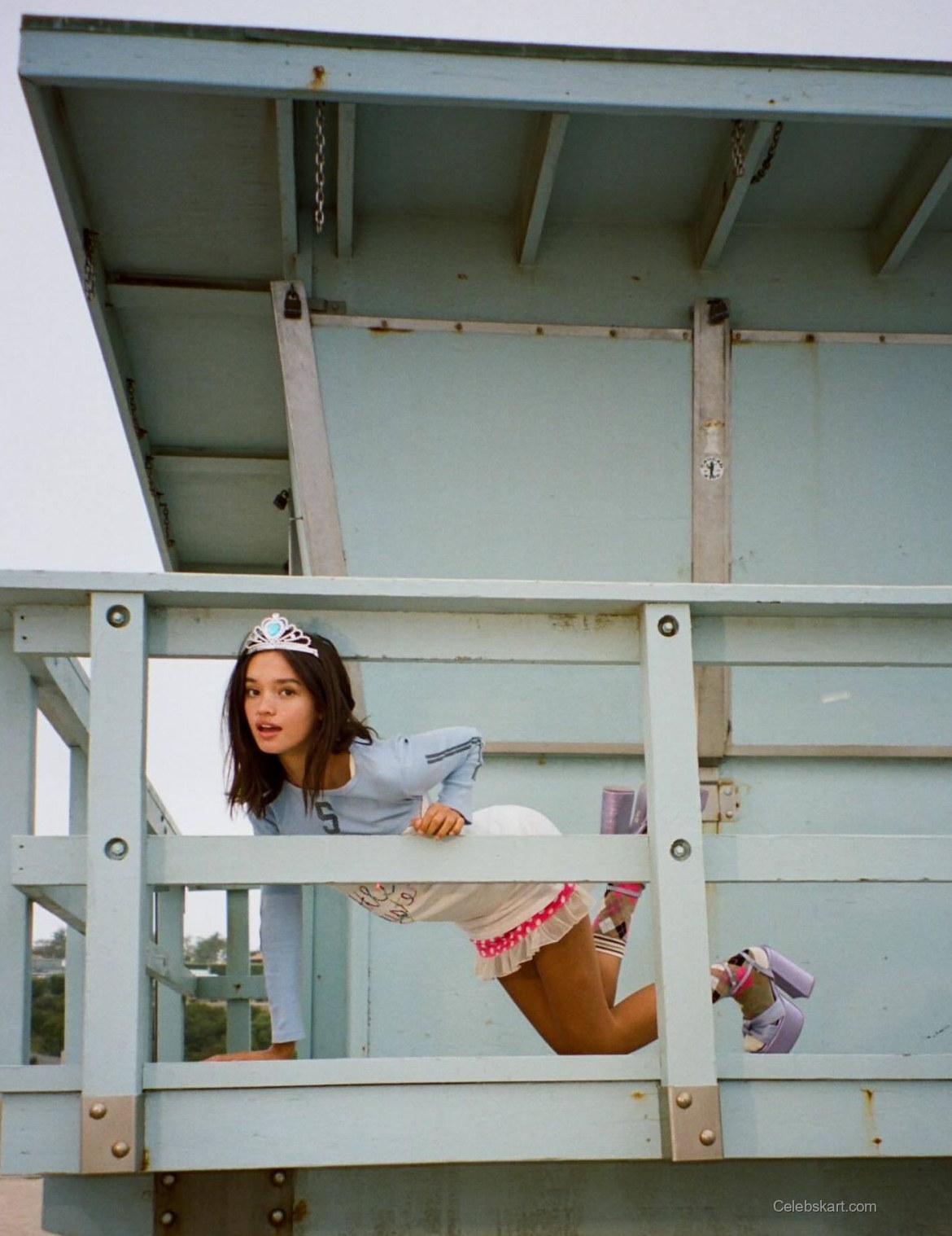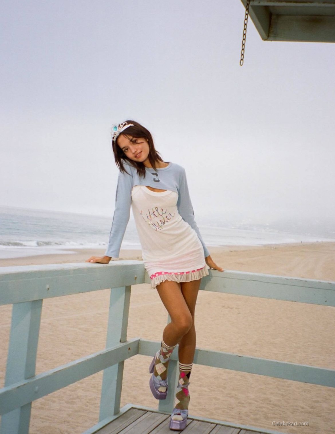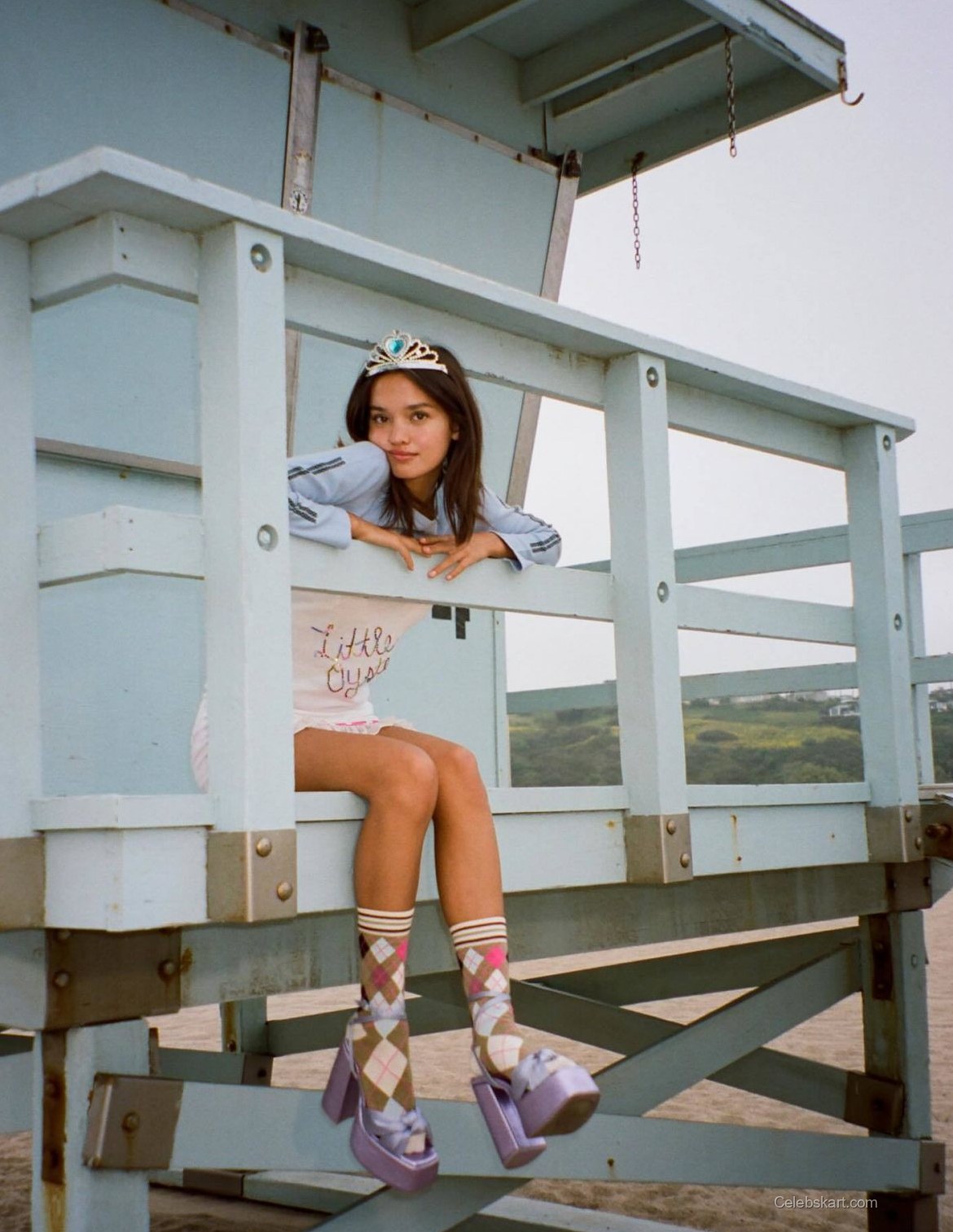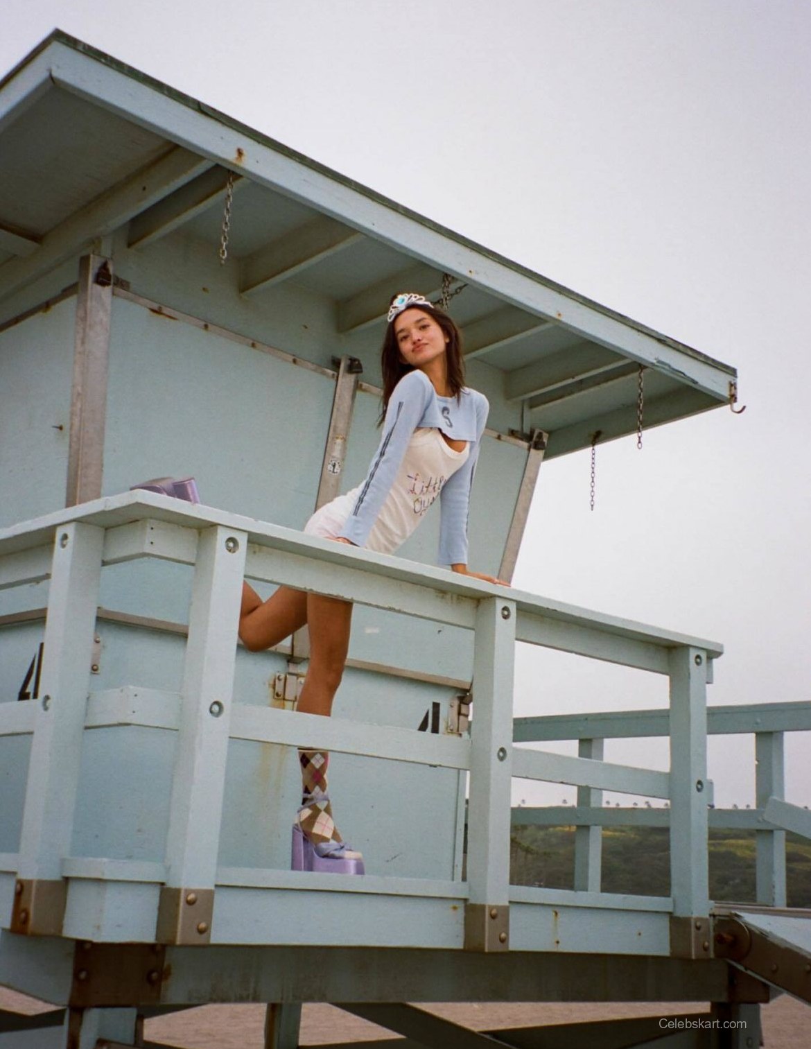 The setting creates a serene atmosphere, with Hammons leaning casually against the lifeguard tower. Her pose exudes confidence and playfulness, with her long hair cascading down her shoulders. The subtle smile on her face enhances the lighthearted vibe of the shoot. The soft lighting highlights her youthful glow, drawing attention to her radiant complexion.