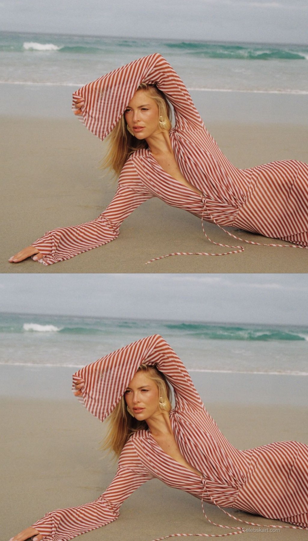 The star donned a striking red and white striped dress that perfectly complemented the beach setting. The dress, hugging her figure and flowing elegantly down to the sand, had both long sleeves and a deep v-neckline, drawing attention to her chic summer style. The fabric caught the light beautifully, adding a glistening effect as she moved, creating a visual delight that resonates well with summer vibes.
