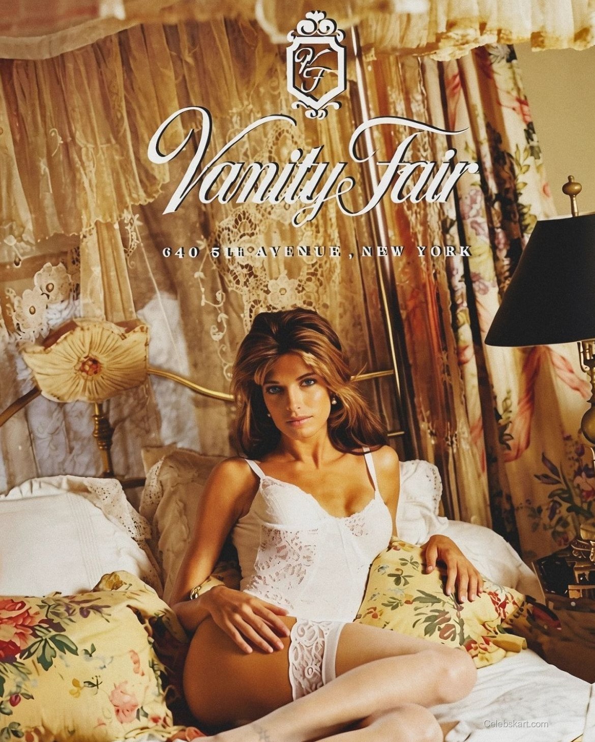 In this intimate setting, Seymour poses gracefully on a bed adorned with floral pillows. Her long, flowing hair cascades around her shoulders, framing her face in soft waves. The background features a romantic drapery, enhancing the overall atmosphere of the shoot. The lighting is soft, casting a warm glow that highlights her features, making her look ethereal.