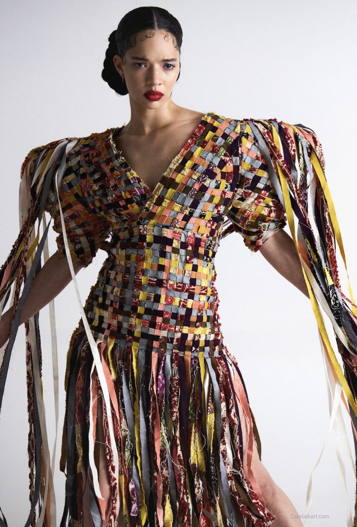 Tanzyn poses confidently against a simple background, allowing her outfit to take center stage. With her hair styled neatly back, she exudes a strong yet graceful presence. The contrast of her deep red lipstick adds to the overall impact of her appearance, complementing the color palette of her outfit beautifully. As she shifts her stance, her movements flow seamlessly with the fringes of her dress, creating a dynamic interplay between motion and style.