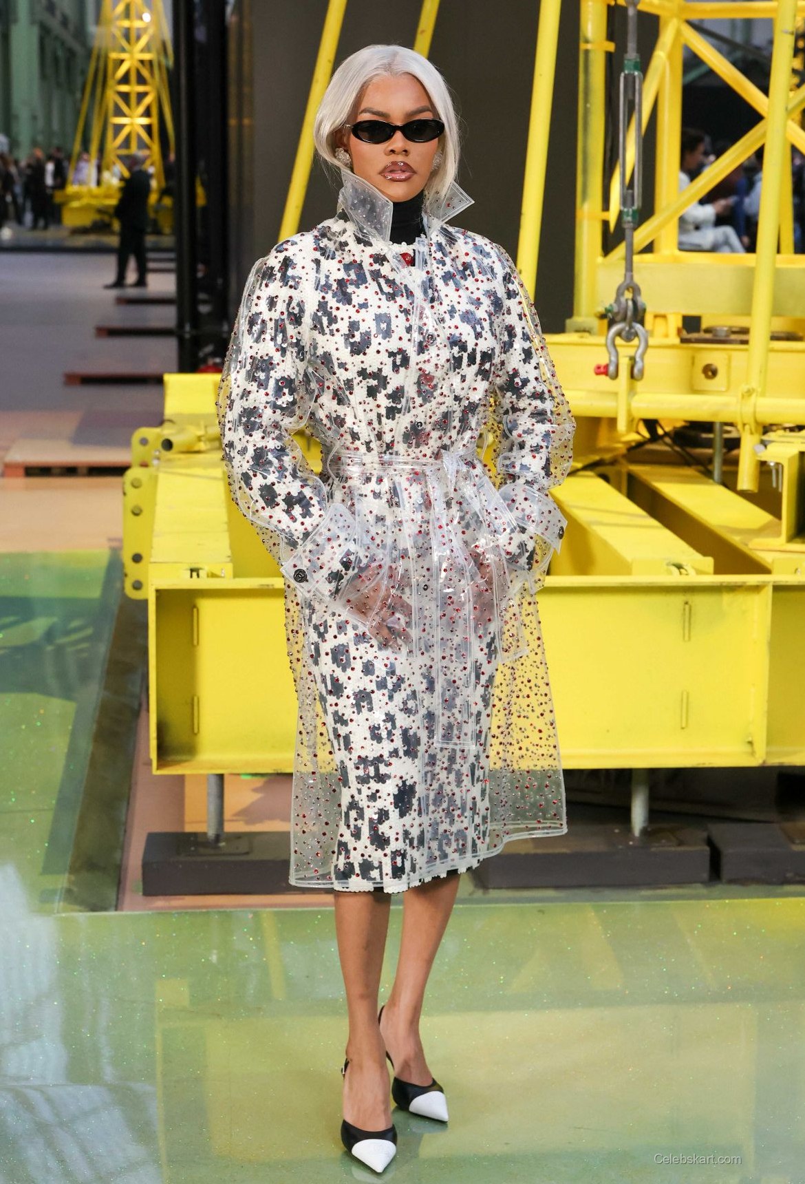 The primary outfit Teyana wore featured a clear, patterned coat that effortlessly combined sophistication with edge. The coat was adorned with a geometric print, complemented by a black turtleneck underneath. As she walked into the venue, intricate details of her ensemble shimmered under the lights, catching the eye of onlookers. Her choice of black and white pointed-toe heels added an elegant touch that balanced perfectly with the iridescent quality of her outerwear.