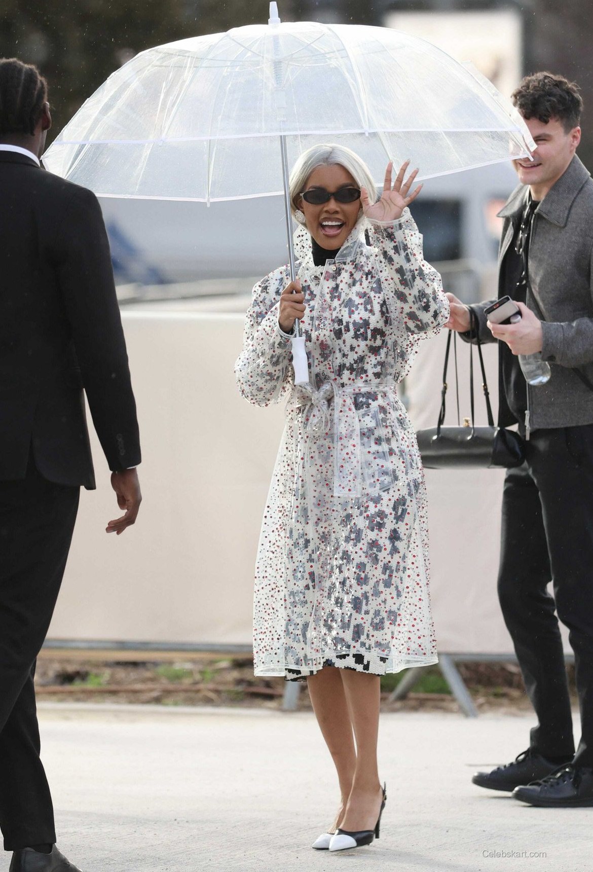 Teyana Taylor was seen striking several poses while at the event. She gracefully waved to fans while holding a transparent umbrella, enhancing her fashionable appearance. The aura of confidence radiated from her as she engaged with the crowd, showcasing her signature style. The contrast of her silver hair against the colorful backdrop created a striking visual, making every moment she spent at the show memorable. Several photographers captured her adjusting her coat, accentuating her commitment to detail in every aspect of her presentation.