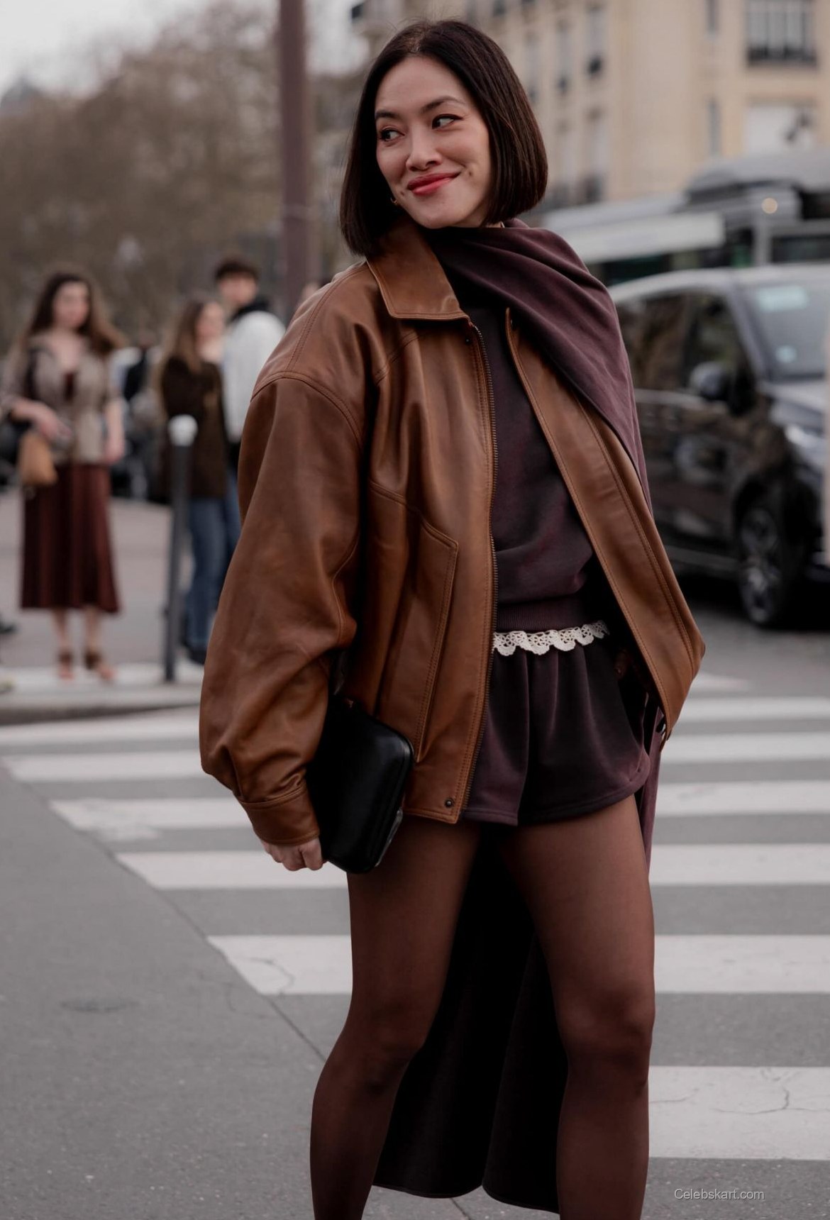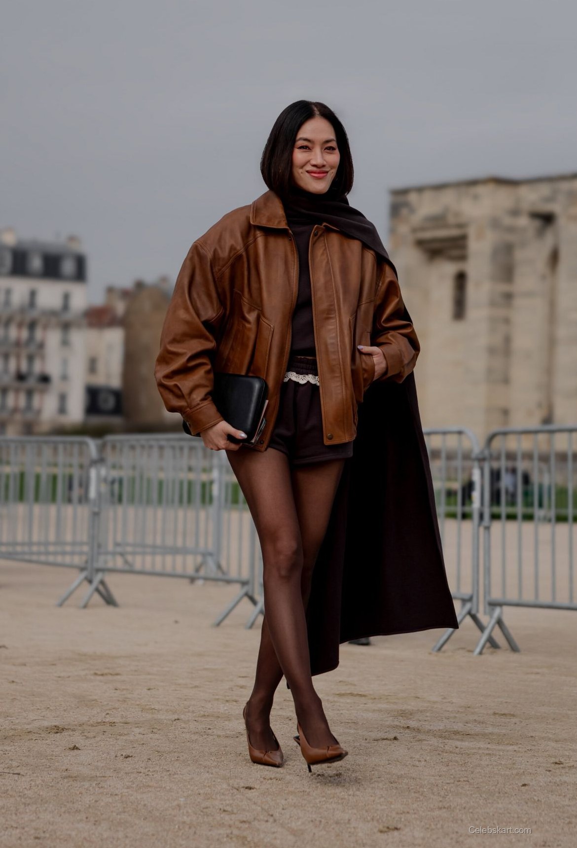 Dressed in an eye-catching brown leather jacket, Tiffany Hsu's outfit was sophisticated yet playful. Underneath, she wore a fitted top with a contrasting dark color, elegantly paired with high-waisted shorts that showcased her figure. The ensemble was complemented by a delicate lace waistband, adding a touch of femininity to her bold look. Her chic black clutch and pointed heels completed the outfit, merging comfort with style beautifully.