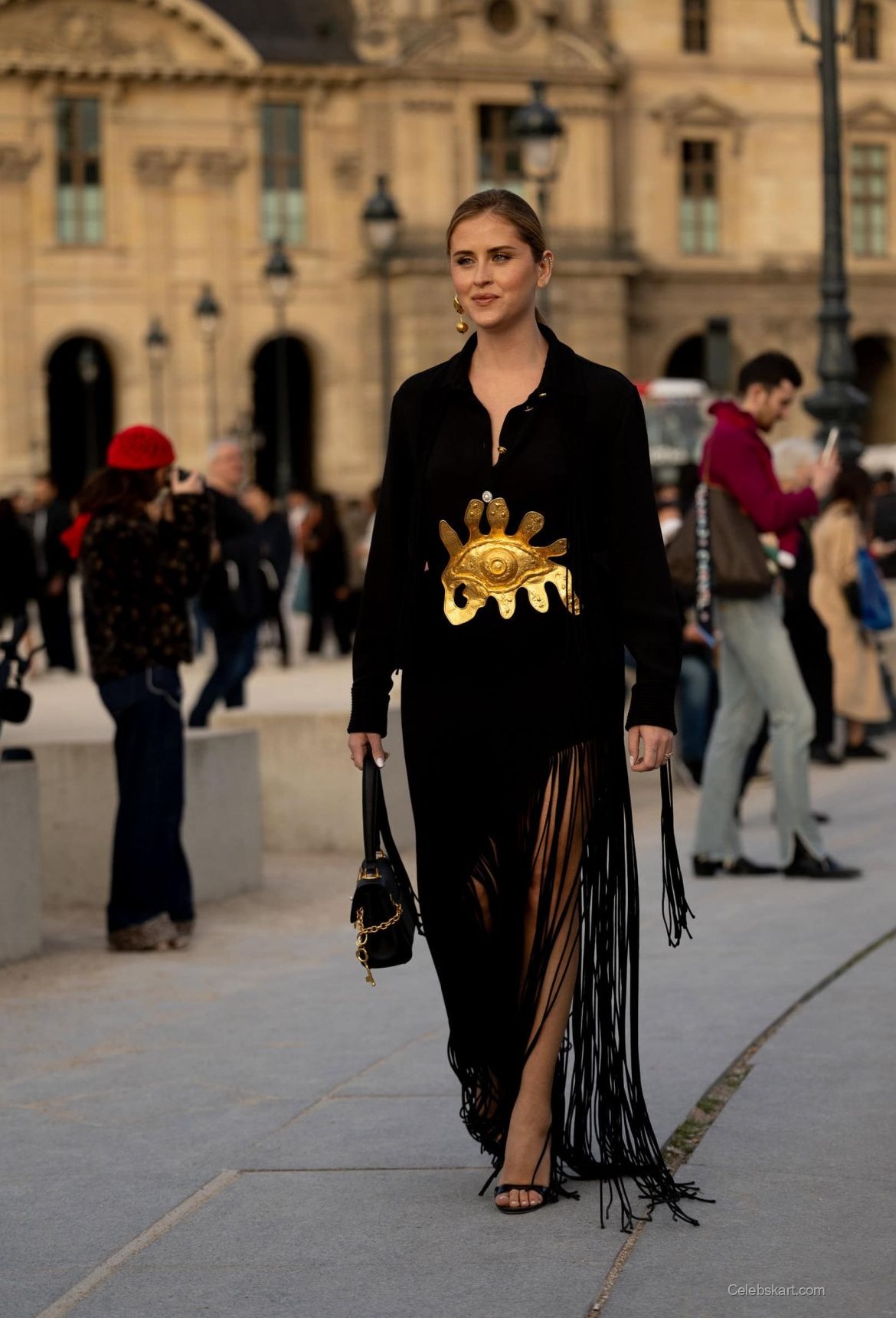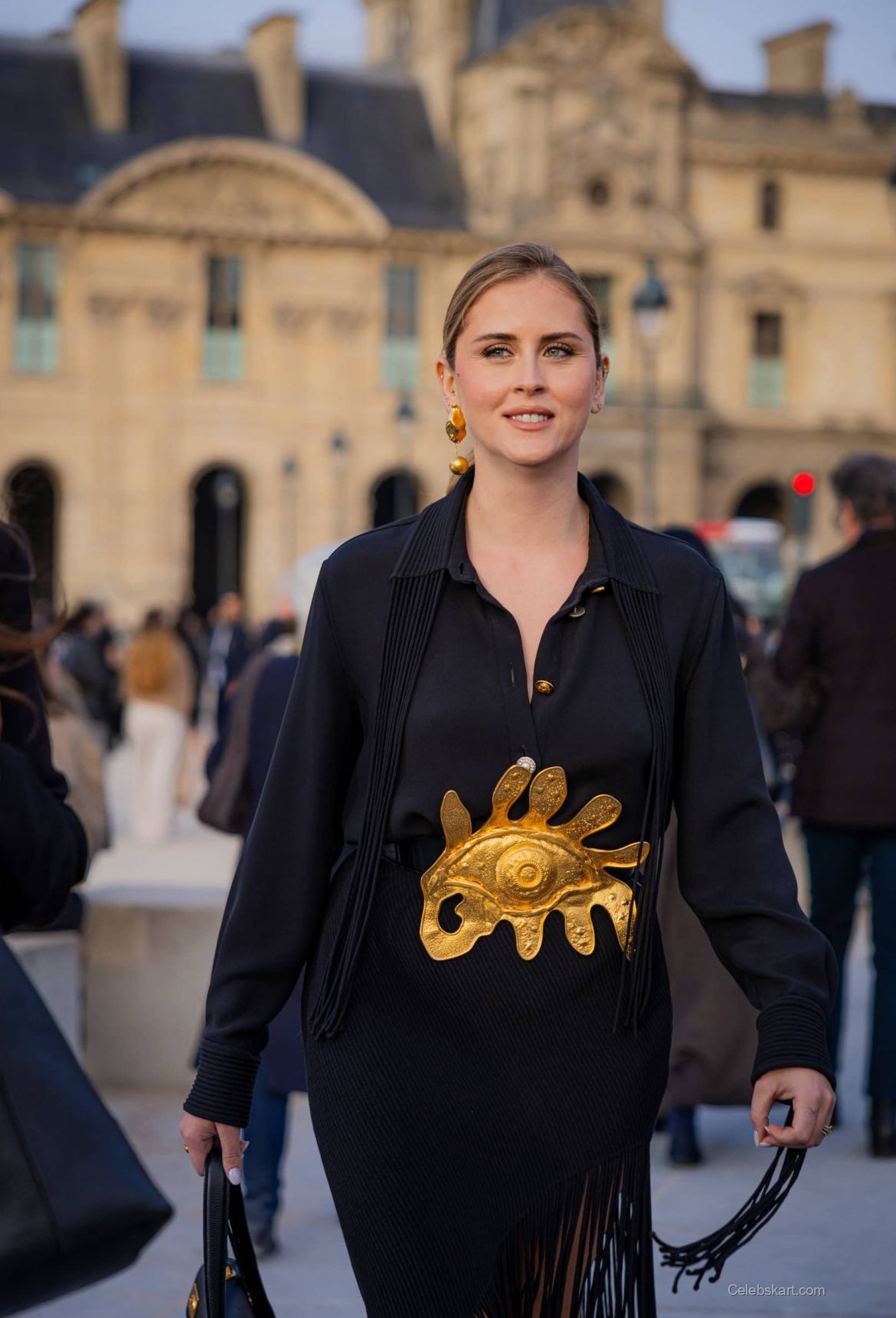 With her hair neatly pulled back, Ferragni radiated confidence as she walked, capturing the attention of onlookers. Her makeup was tasteful, accentuating her features without overpowering the look. Behind her, the picturesque backdrop of Paris created an enchanting atmosphere, making her the focal point amid the bustling fashion crowd. A glance at her handbag revealed a stylish design that complemented her outfit flawlessly.