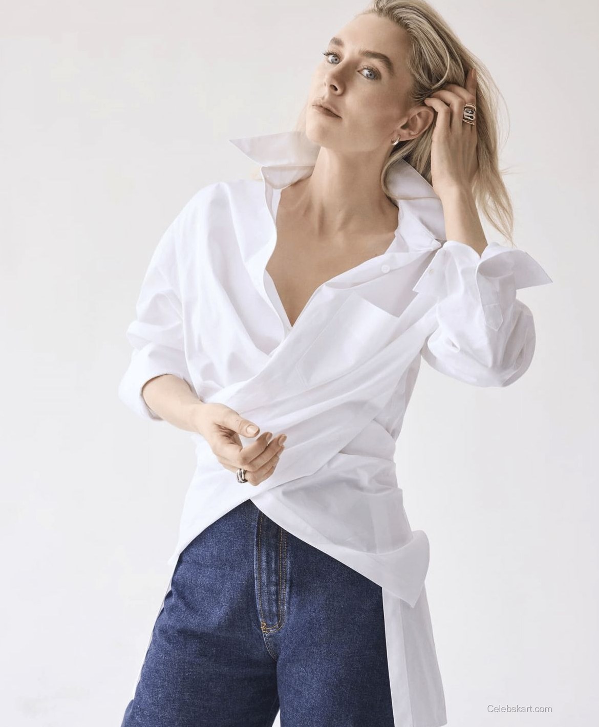 In her latest photoshoot, Vanessa Kirby showcases a striking ensemble that features a crisp white shirt styled elegantly with denim. The shirt, featuring exaggerated collar details, has a unique twist that enhances its classic silhouette. With her shirt casually styled, she exudes an air of confidently relaxed charm. The choice of denim adds a contemporary touch, making this outfit versatile for various occasions. It’s a look that clearly highlights her fashion-forward thinking, suitable for any aspiring fashionista.