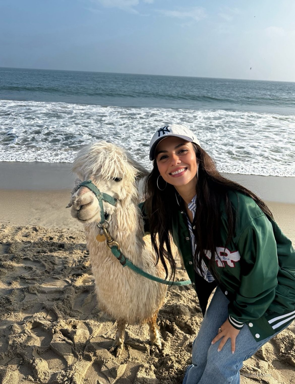 Victoria's outfit was centered around a cropped top with graphic print that added a splash of fun to her look. The relaxed denim jeans contributed to a casual yet fashionable vibe, effortlessly demonstrating her ability to blend comfort with aesthetic appeal. Accentuating her overall look was a cozy purple wrap that was tied around her waist, introducing an additional layer and color contrast.
