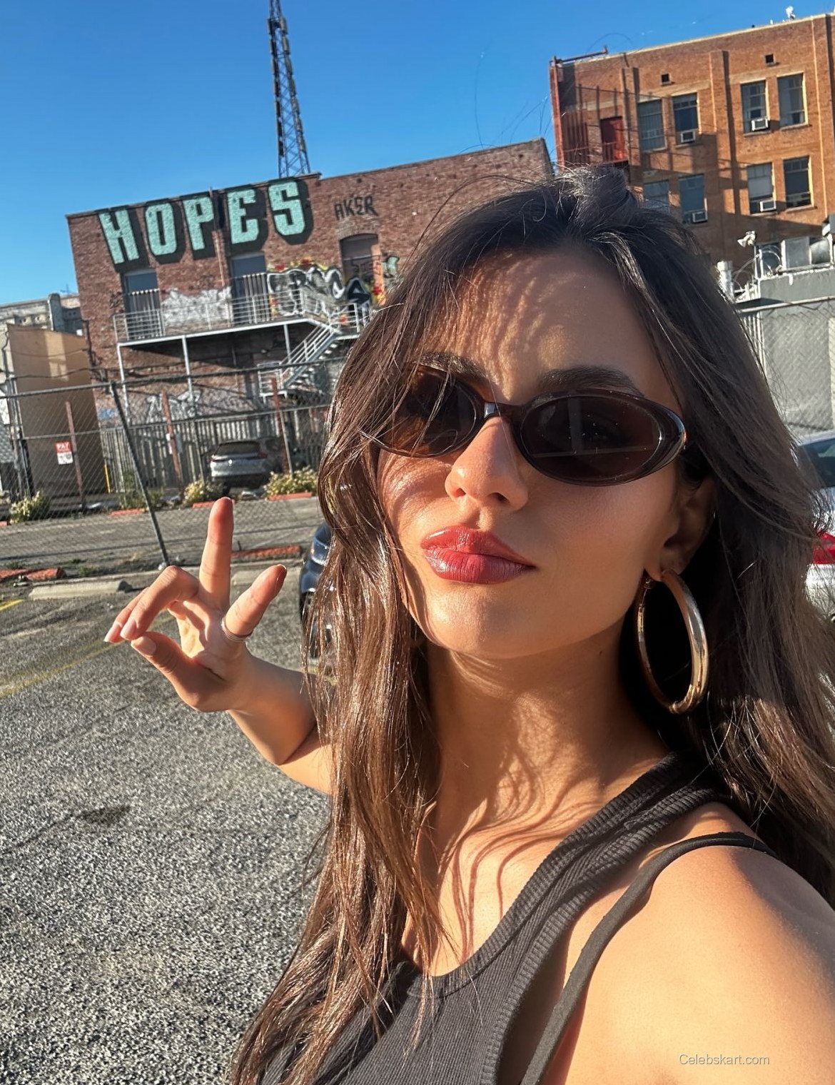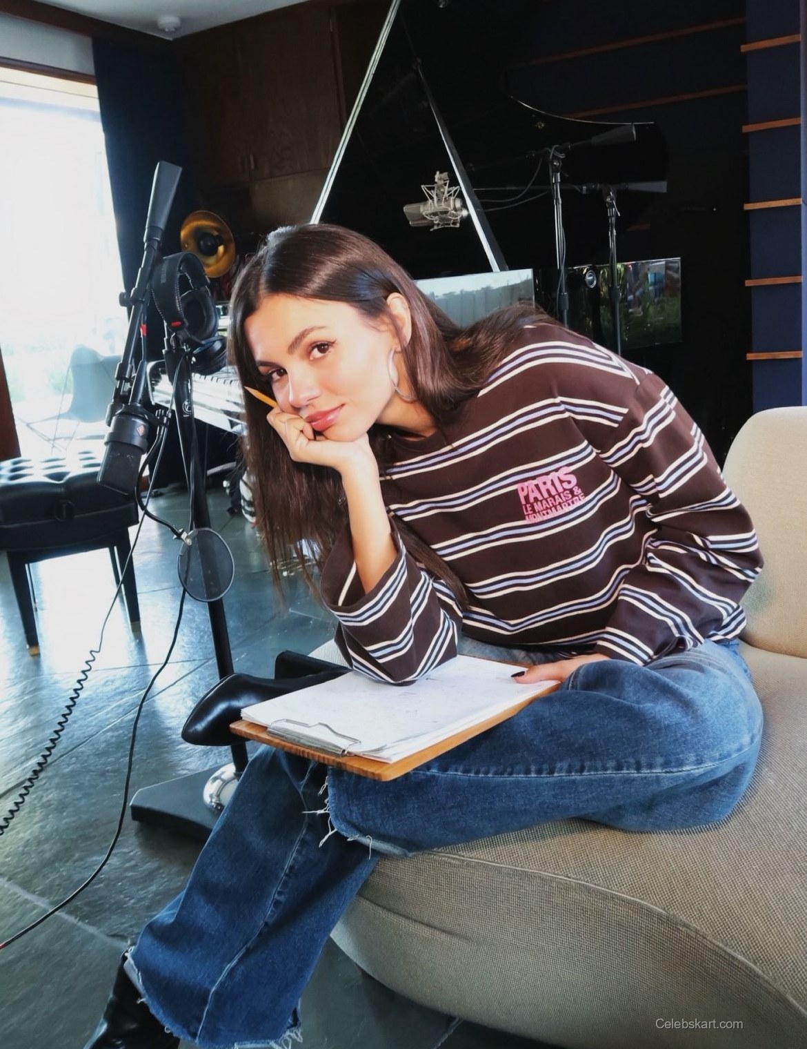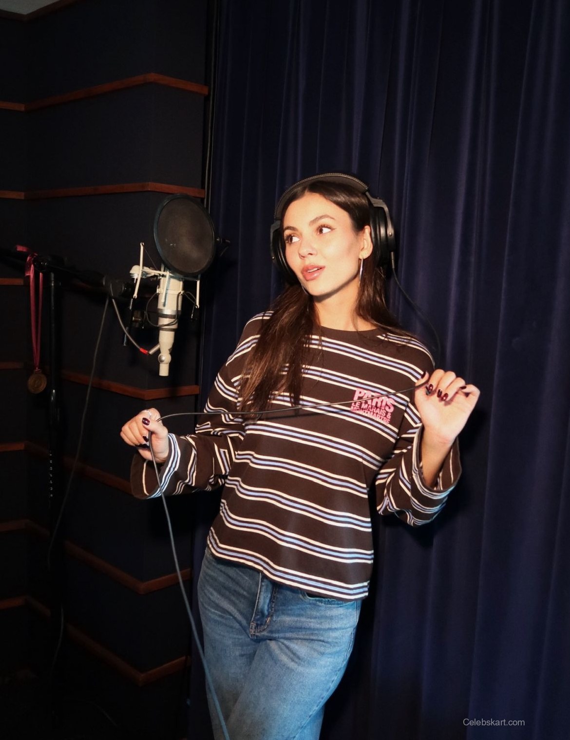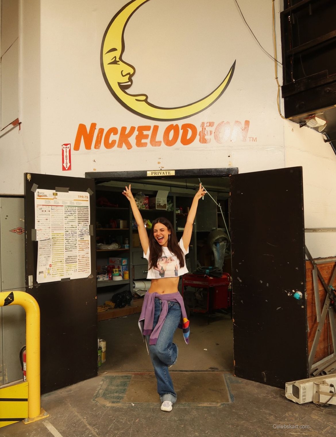 In one candid moment, Victoria could be seen striking a fun pose near the Nickelodeon logo, her arms raised in excitement. The setting was filled with creative energy, reflecting the vibrant atmosphere of the studio. Sunlight streamed through the door behind her, adding a warm glow to the scene. In another shot, she was seen playfully leaning against the doorframe, wearing a broad smile that showcased her infectious joy.