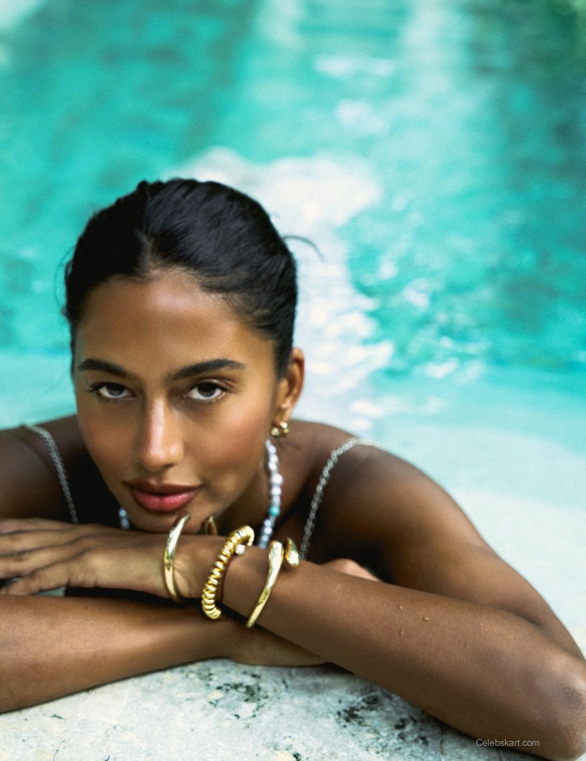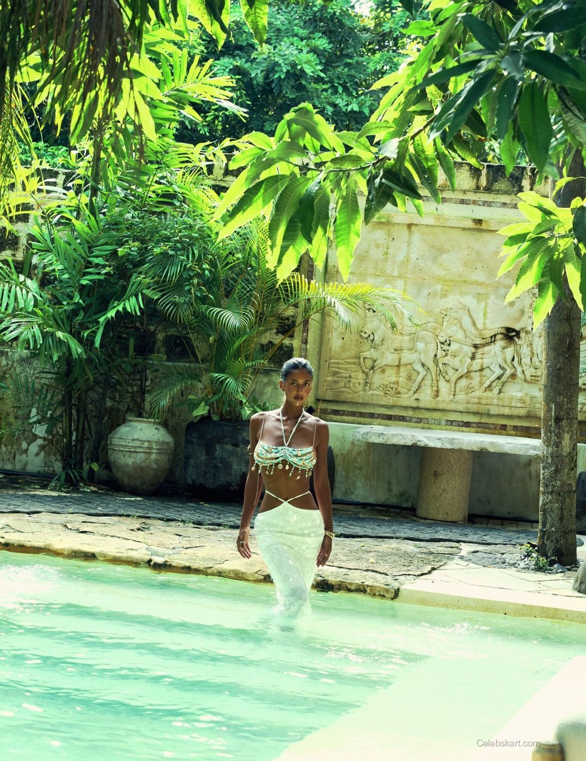 This photoshoot features VIKTORIIA wearing a striking beaded top that beautifully highlights her figure. The aqua and white hues of her outfit reflect the tropical scenery, blending perfectly with the vibrant environment. She pairs the top with a diaphanous white skirt, adding a touch of softness while maintaining an alluring look. The unique accessories, including layered jewelry, further elevate her style, establishing her as a fashion icon. If you want to find more inspiring pieces, check out our selection of elegant beachwear.