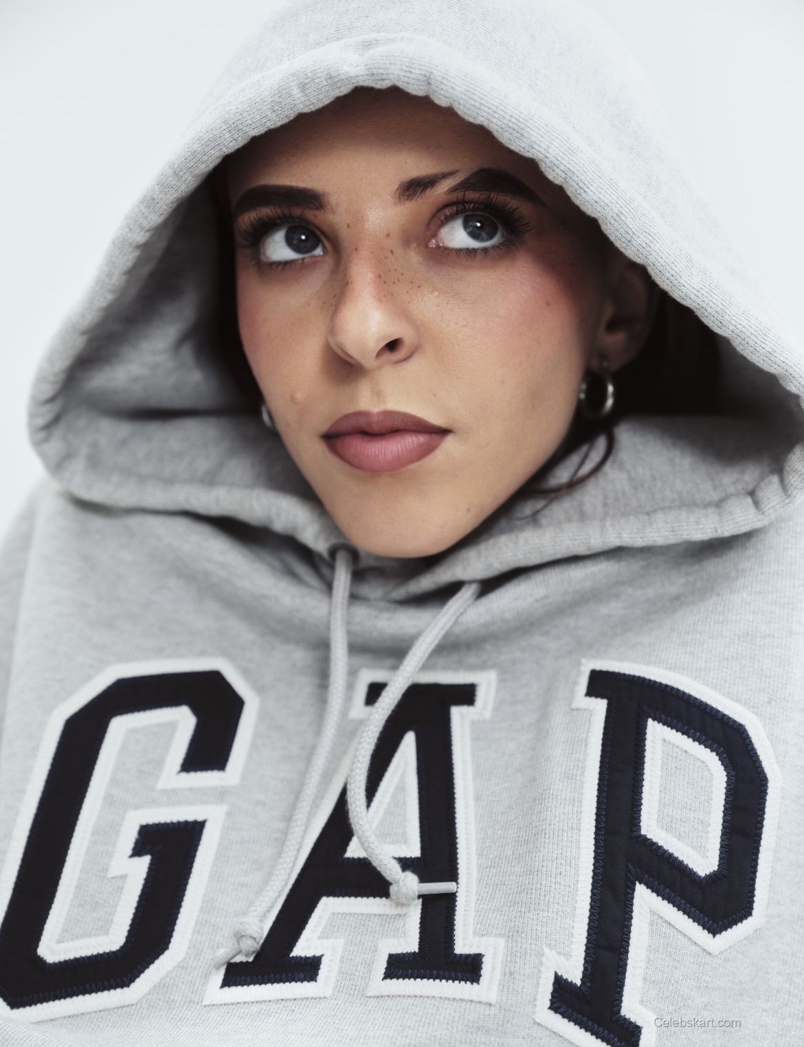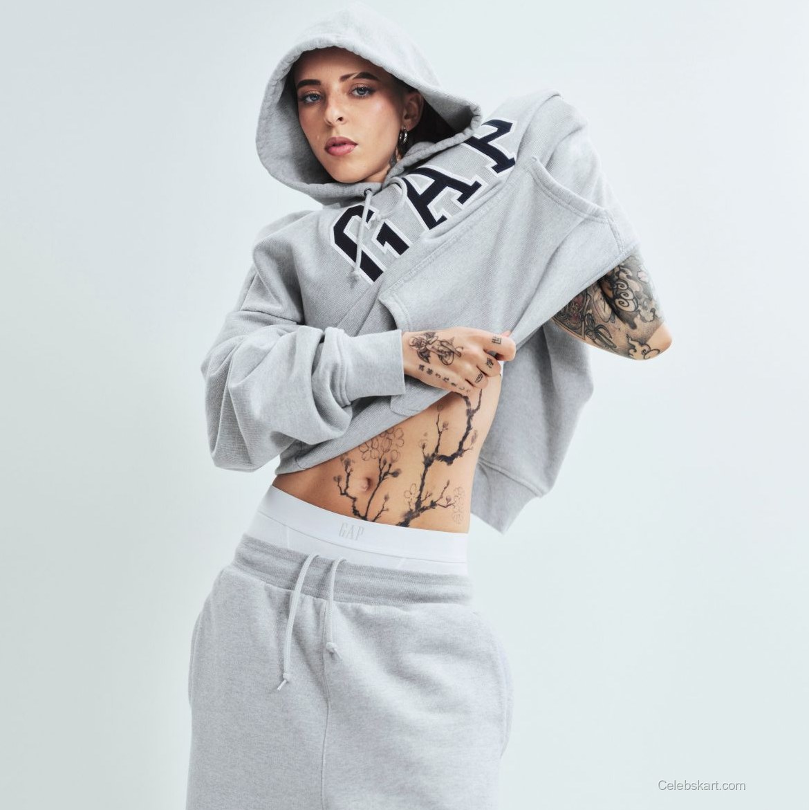 In the campaign, YOUNG MIKO sports a grey cropped hoodie featuring the iconic GAP logo prominently displayed across the chest. The hoodie is paired with matching grey sweatpants, creating a cohesive look. The outfit is completed with a subtle waistband that also features the brand name, enhancing the sporty vibe. This ensemble captures a relaxed yet chic style that's perfect for everyday wear.