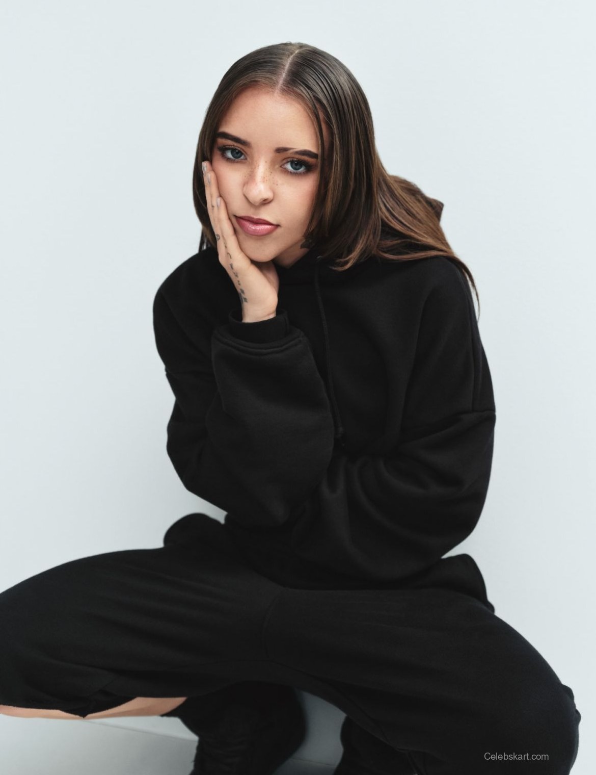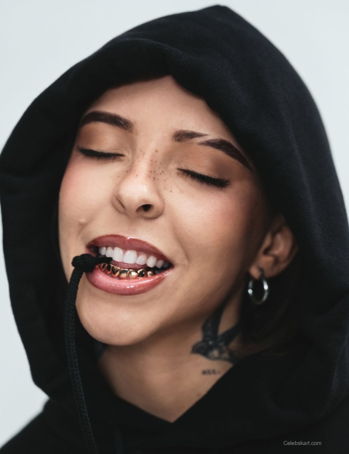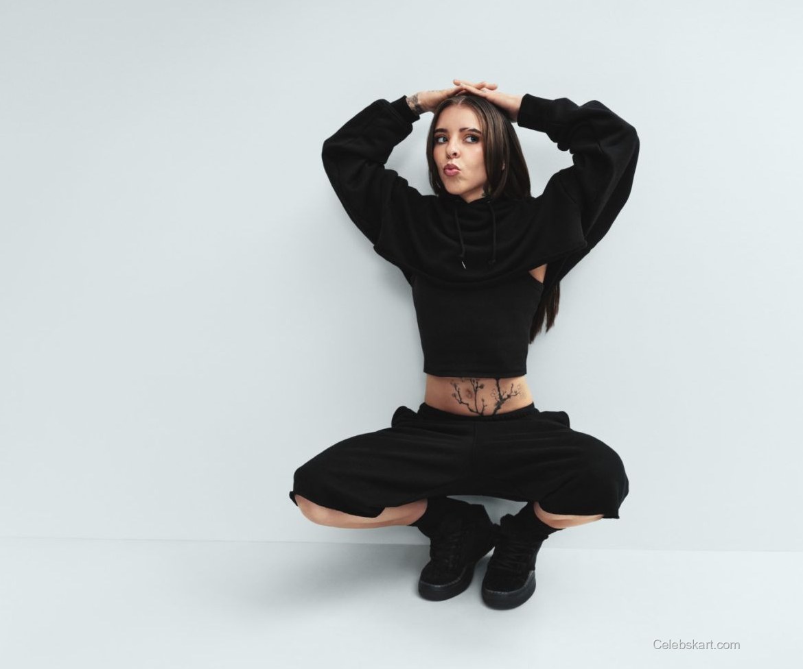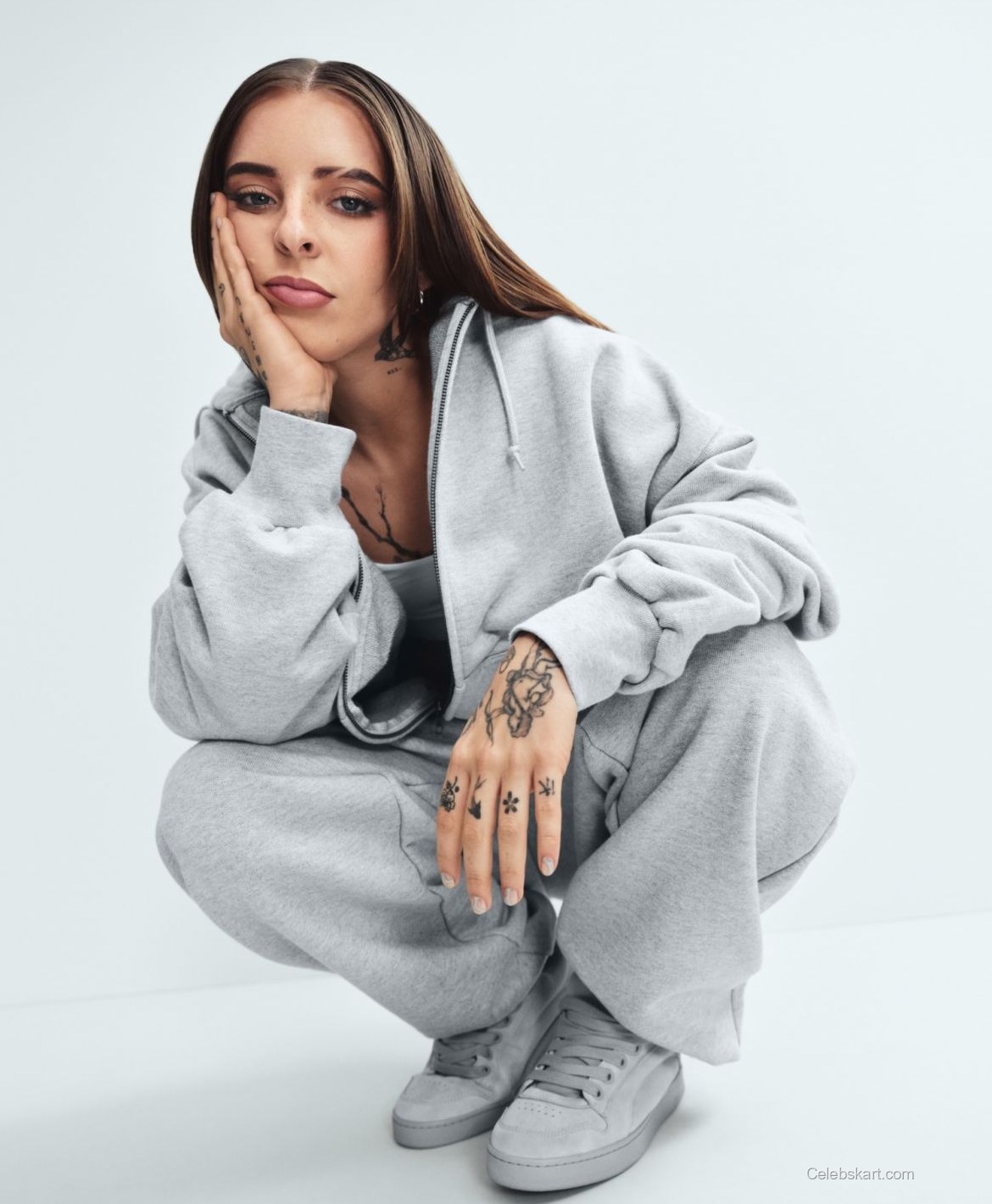 The backdrop of the photoshoot is minimalistic, allowing YOUNG MIKO's outfit to stand out. She poses confidently, with her hand pulling up the hem of the hoodie to reveal a glimpse of her stylish waistband. The lighting is soft, creating a warm atmosphere that complements her look. Her tattoos are visible, adding an edge to the overall aesthetic, while her expression exudes a sense of confidence and approachability.