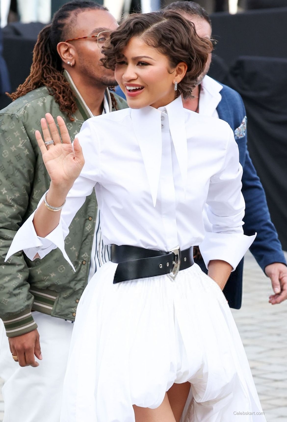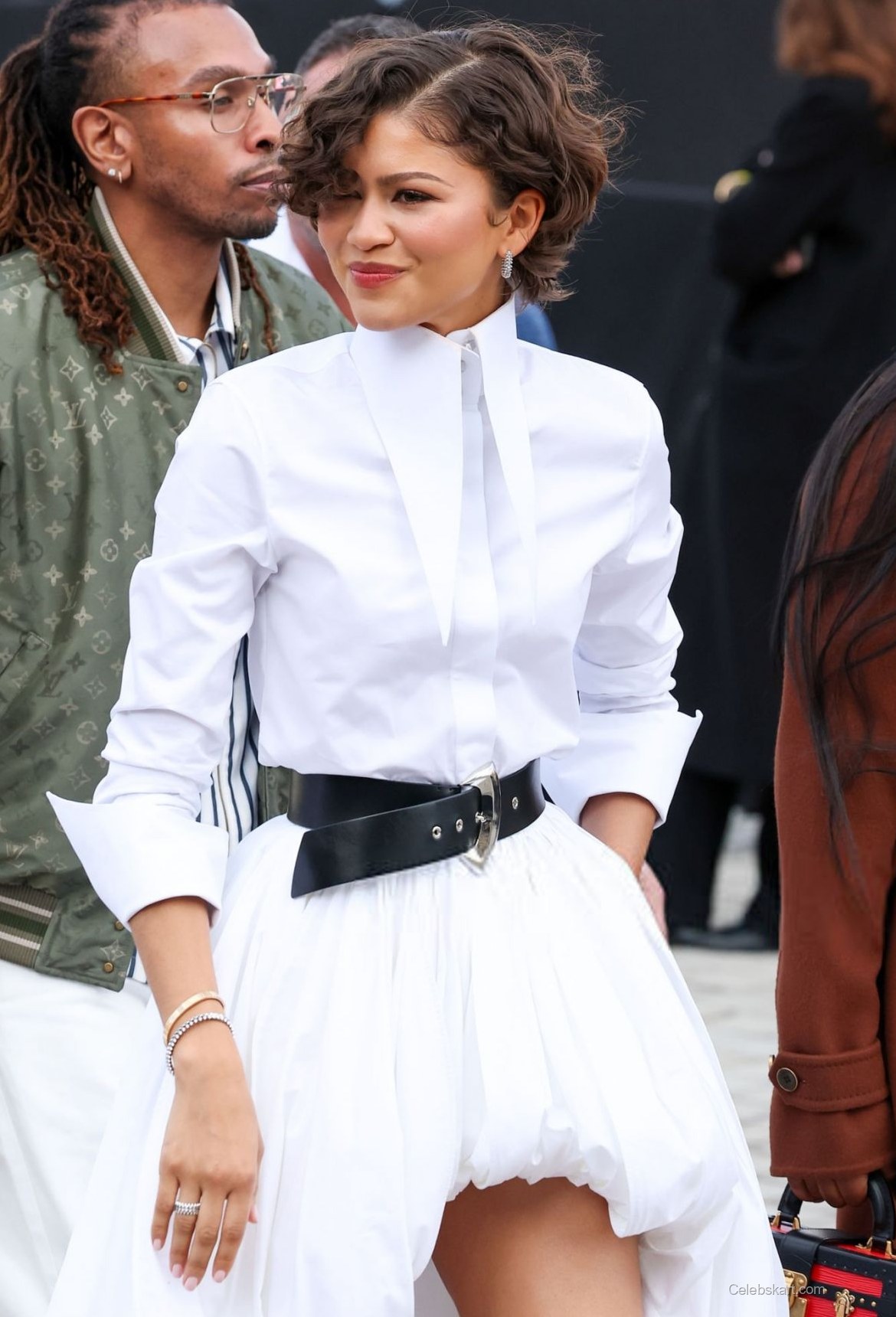 Zendaya’s ensemble featured a crisp white shirt with an intricate collar. The shirt's defined lines highlighted her silhouette and offered a contemporary twist to classic elements. A bold black belt cinched her waist, adding a sharp contrast and emphasizing her figure. The airy white skirt completed the look, showcasing a high-low design that allowed for a glimpse of her legs, enhancing its playful nature. The combination created a refreshing look that stood out at the renowned Paris fashion event.