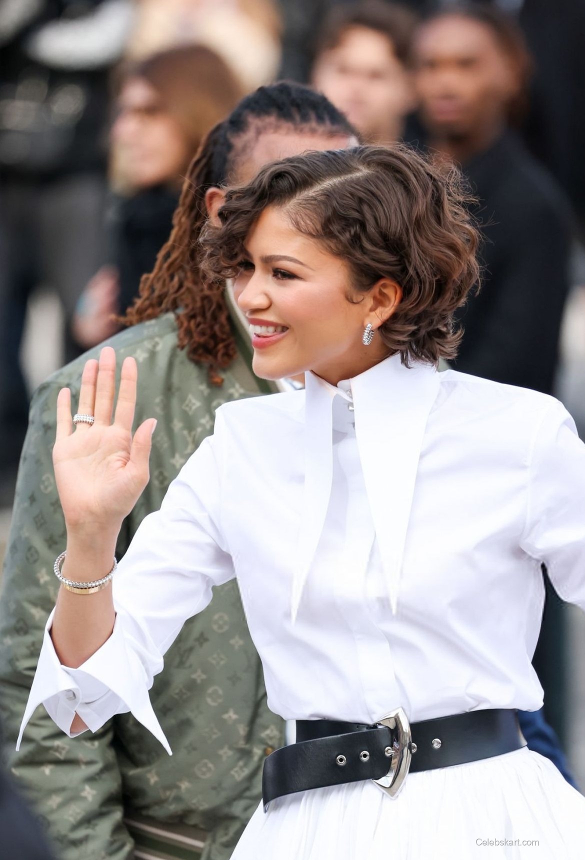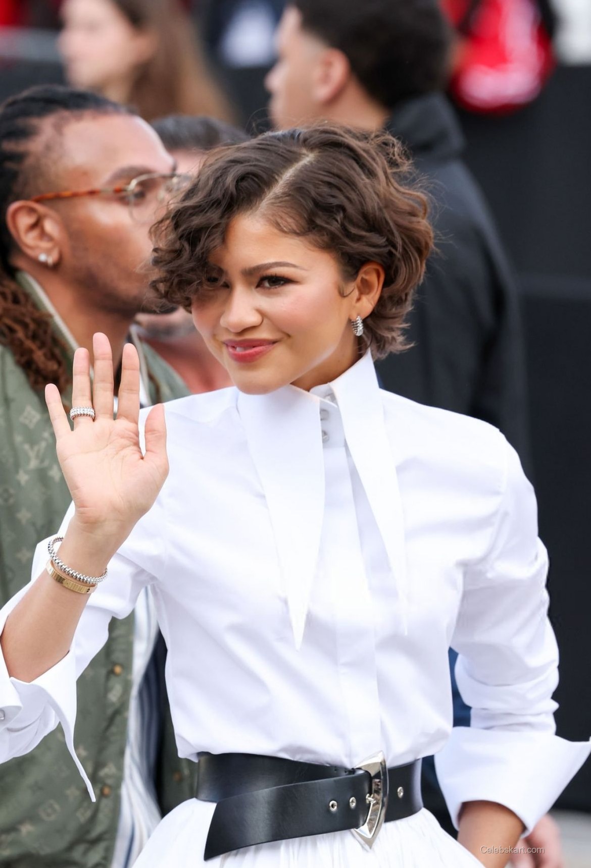 As she arrived, Zendaya greeted fans with her characteristic smile and warmth. Posing confidently, she waved gracefully, engaging with the crowd. Her hairstyle, featuring soft, tousled curls, framed her face beautifully, enhancing her youthful exuberance. The smooth texture of her outfit contrasted with the urban backdrop, creating a harmonious visual appeal. Furthermore, her choice of sleek black heels added height and sophistication to her overall appearance.